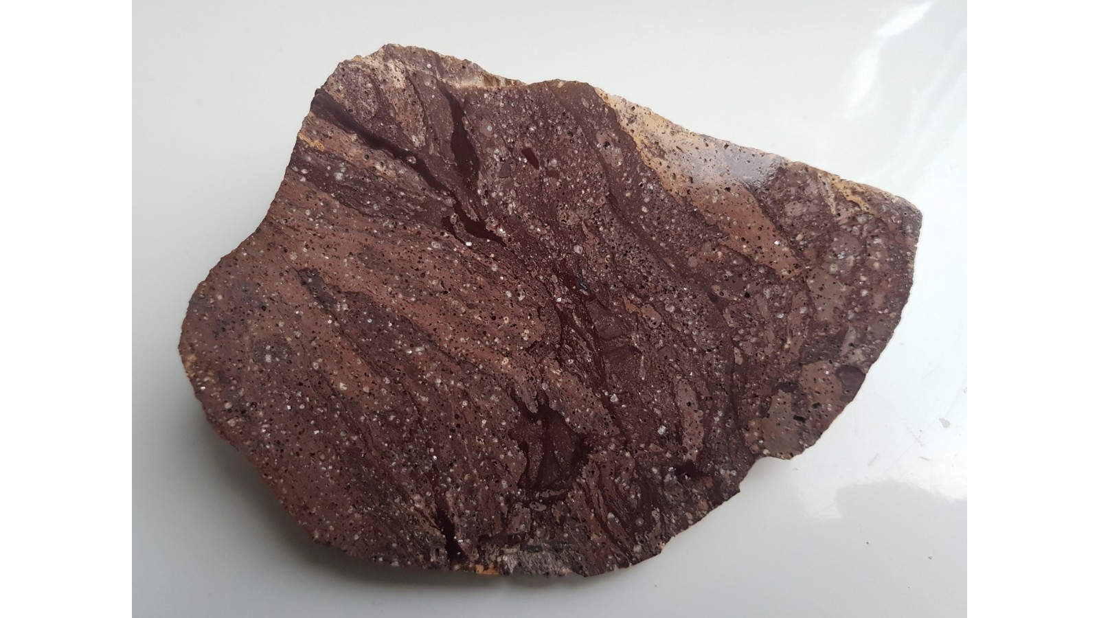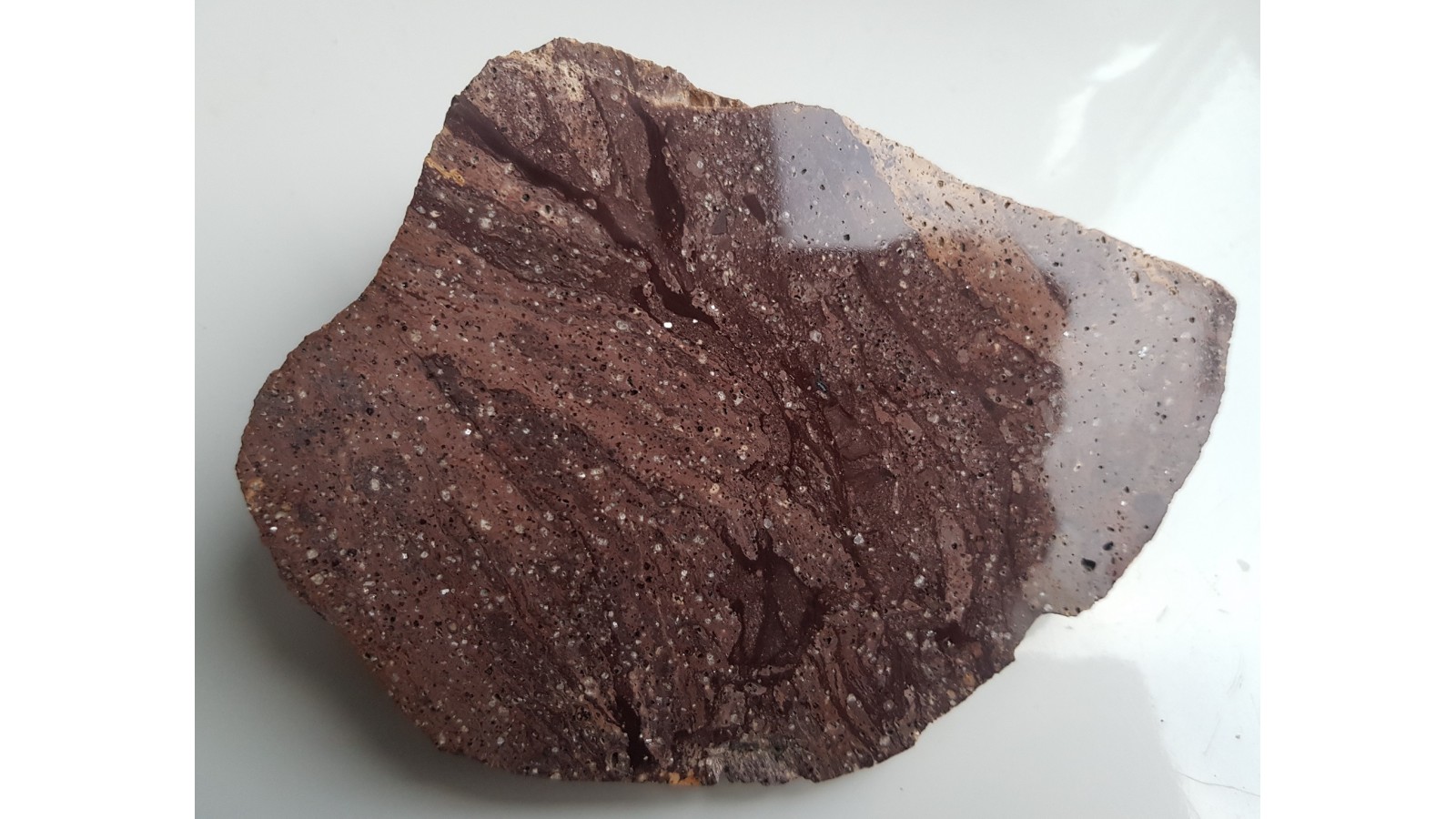 Nieznana dotąd skała - ryolit z Gór Kaczawskich z licznymi, iryzującymi skaleniami. Wyjątkowo ozdobna odmiana nieprzeobrażonego hydrotermalnie ryolitu z Sudetów. Skała wykazuje także tekstury fluidalne. Okaz jednostronnie polerowany. "Autorskie", nieopisywane dotąd wystąpienie.