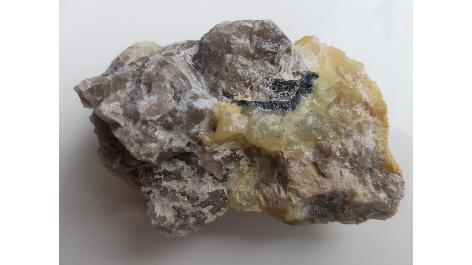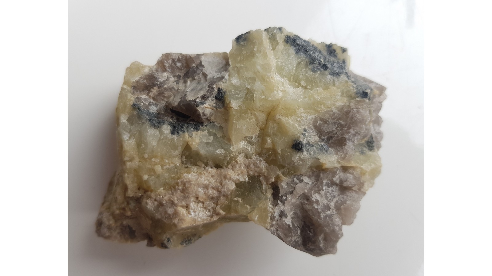 Okaz prehnitu z kamieniołomu w Zimniku k. Strzegomia. Żółtozielony prehnit wrośnięty w kwarc. Wyraźne, masywne skupienia, nie naskorupienia.