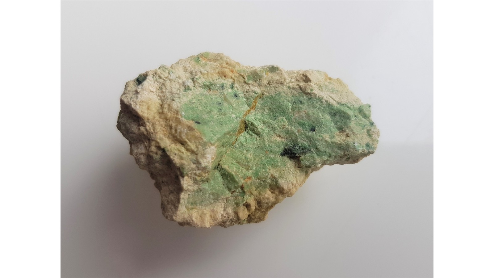 Okaz msywnego grossularu chromowego (barwa chromowizielona) w wrostkami ciemnych spineli z kamieniołomu serpentynitu w Nasławicach. Bardzo rzadka odmiana granatu chromowego. Strefa z grossularem chromowym została już wyeksploatowana. Rzadkość mineralogiczna z Sudetów.