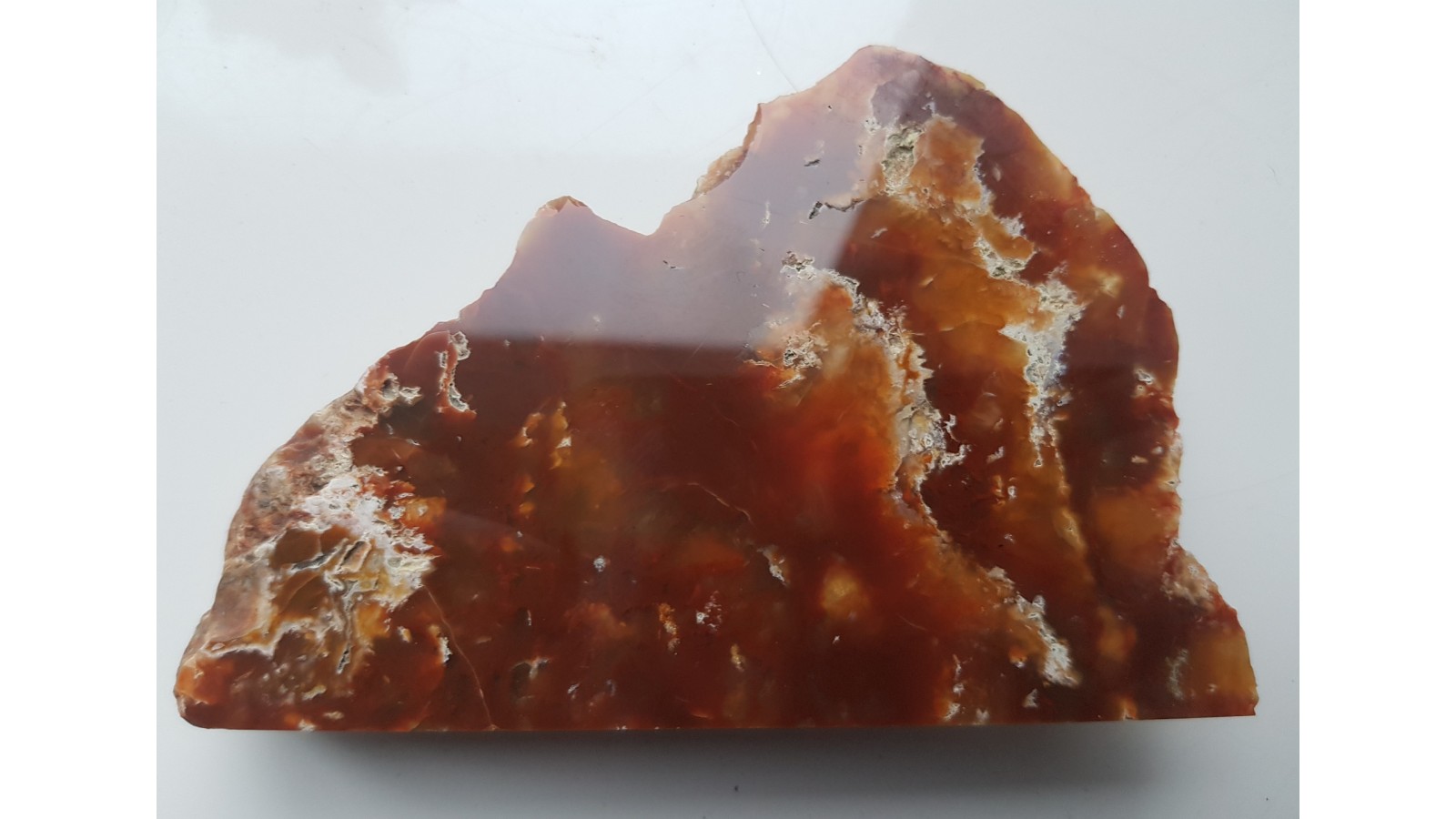 Okaz chalcedonu w barwach czerwono-brązowych. Piękny poler. Próbka częściowo przeświecająca. Strona tylka naturalna, nie cięta. Okaz pochodzi z aluwiów Nysy Kłodzkiej.