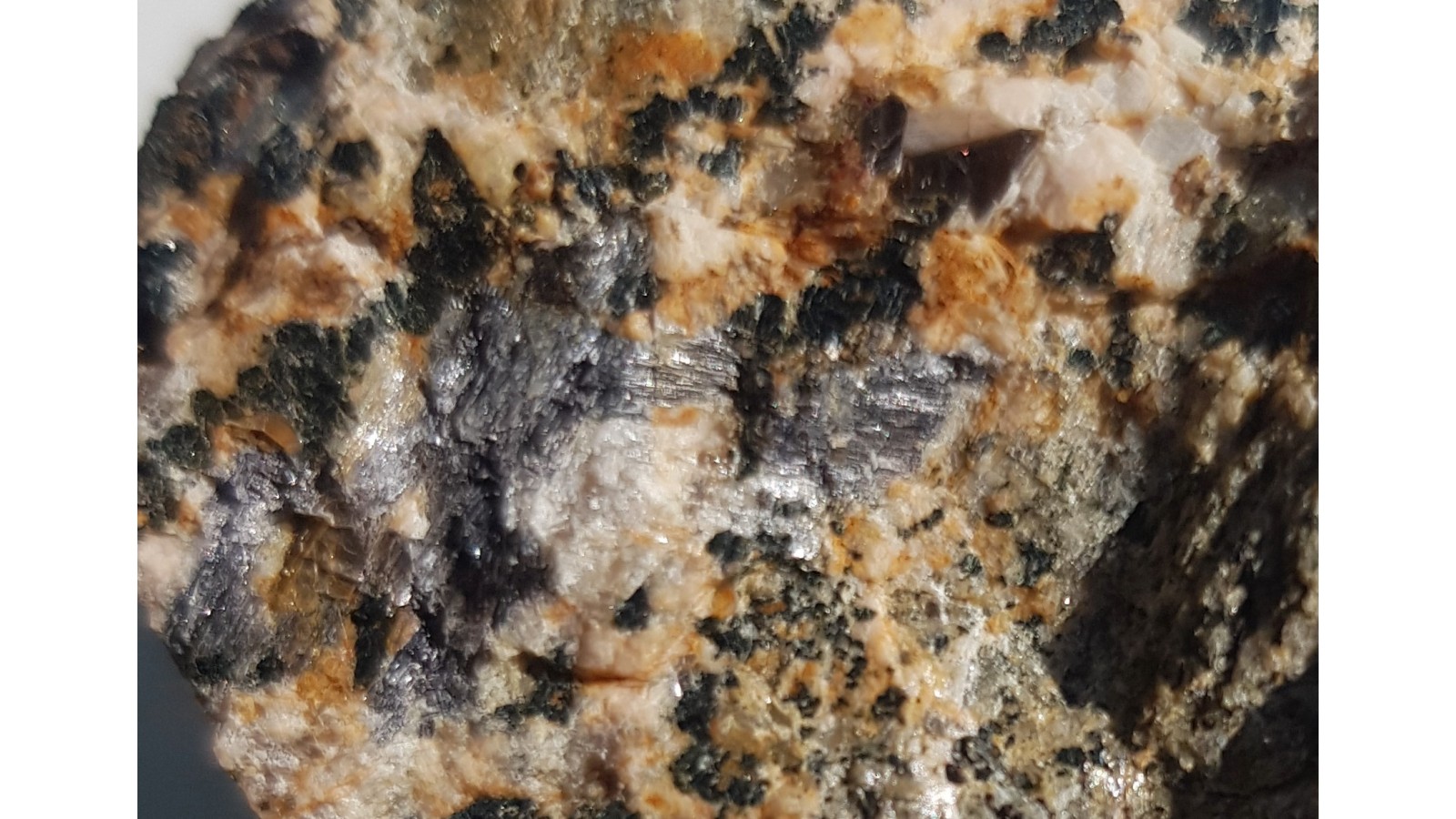 Wrośnięte w pegmatyt korundowy skupienia igiełkowatych kryształów fioletowego dumortierytu. Wielkość samego skupienia około 1 cm. Absolutna rzadkość mineralogiczna opisywana jako minerał towarzyszący szafirom z Kruczych Skał w Karpaczu. Kilka okazów w kolekcjach minerałów sudeckich.