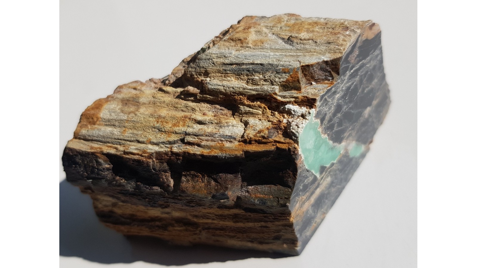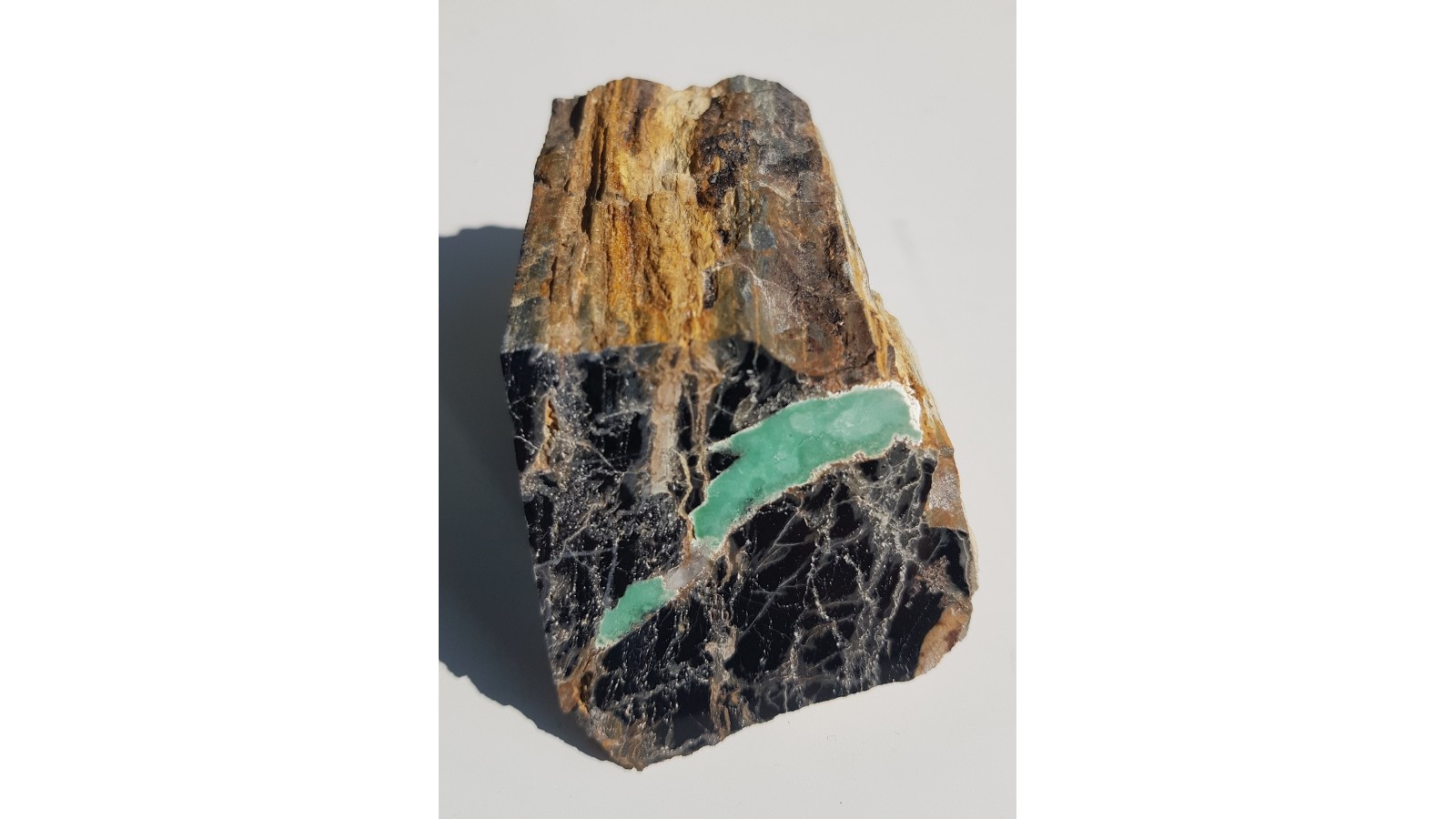 Oferujemy okaz turkusu z Pustkowa Wilczkowskiego koło Wrocławia. Okaz to miąższa żyła turkusu w czarnym, sylurskim łupku grafitowym, w których znajdują się wystąpienia turkusu. Okaz z jednej strony polerowany, co uwidacznia minerał. Świetny do kolekcji tematycznej bądź sudeckiej.