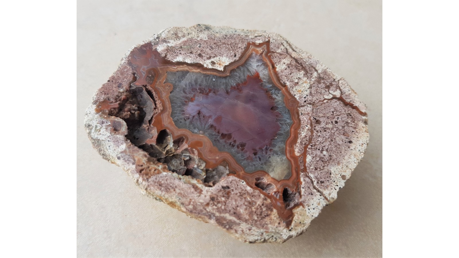 Polerowany agat z Nowego Kościoła. Tylna strona naturalna powierzchnia buły agatowej.
