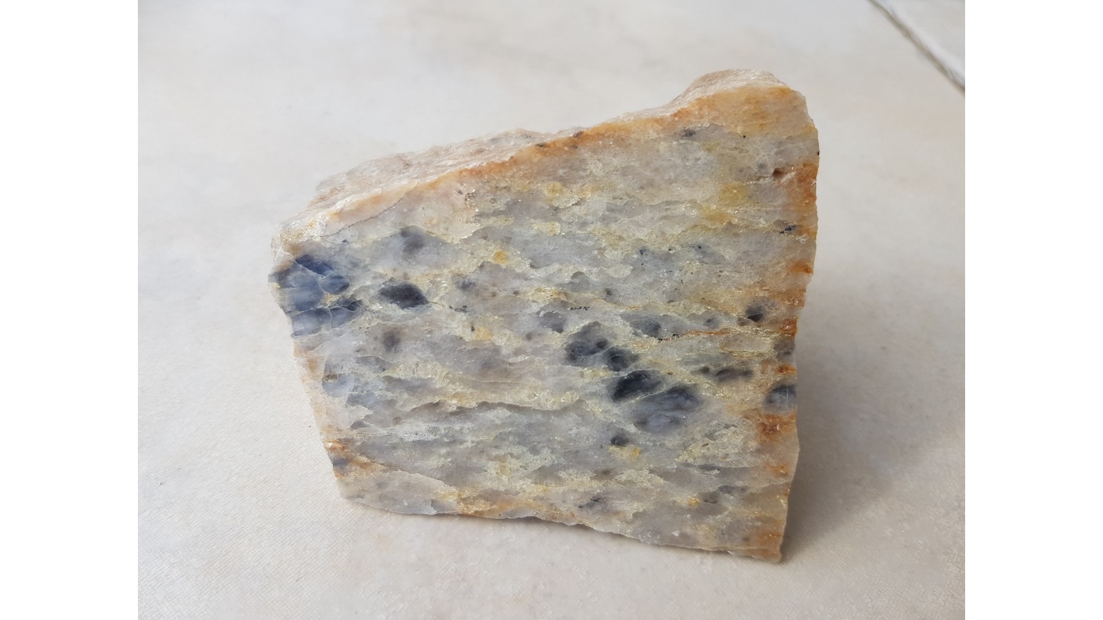 Polerowany okaz grejzenu z odsłonięcia w okolicach Giebułtowa. Okaz z pasma grejzenów Mlądz-Giebułtów, ze skrajnej lokalizacji pasa wystąpień tej skały. Skała metasomatyczna, zmieniony granit. Doskonały poler.