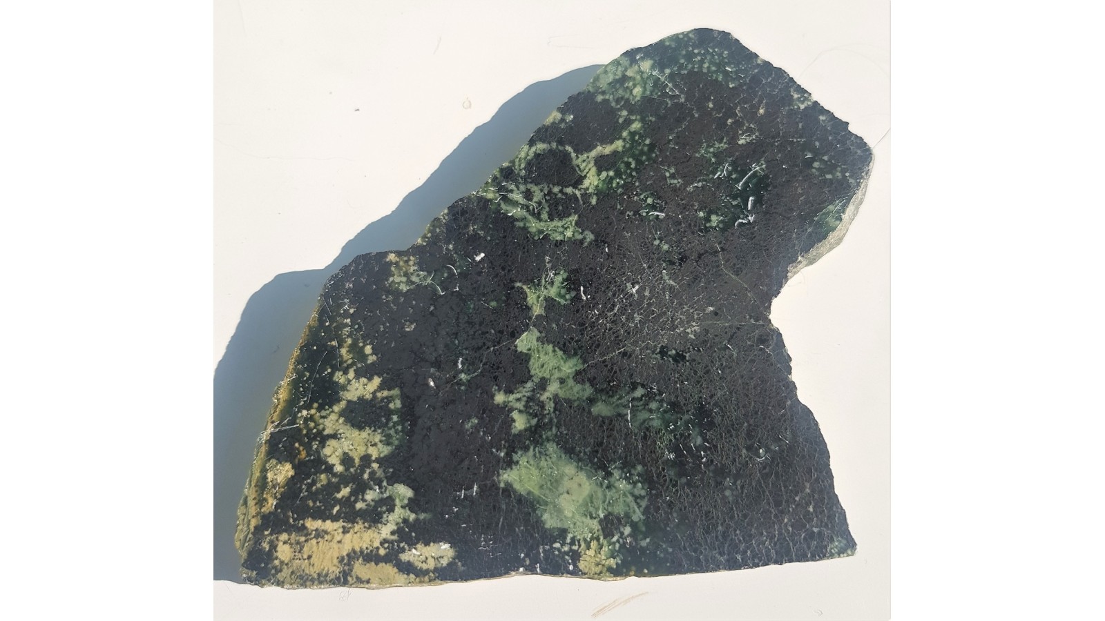 Płytka rudy chromitowej z dużymi skupeiniami chromitu w przeświecającym serpentynicie (oficie). Jednostronnie polerowana. Strona przeciwna cięta.