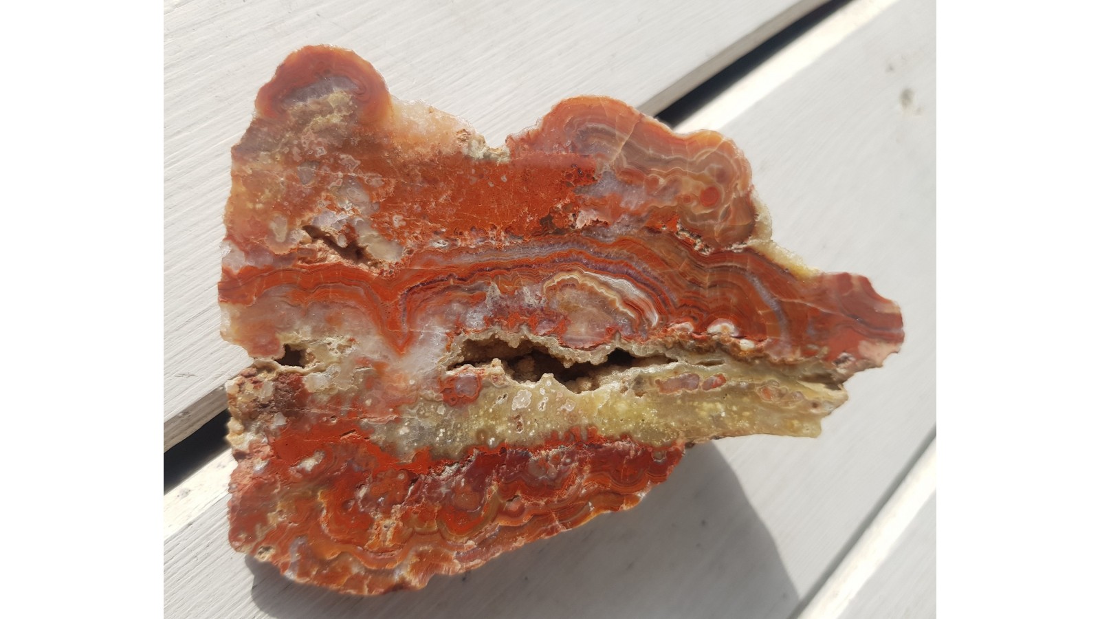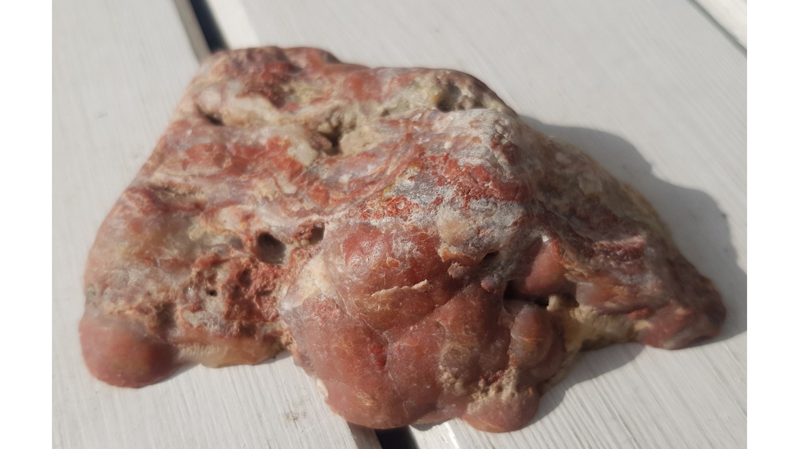 Agat o barwie intensywnej czerwieni z wyraźnymi "naskorupieniami" wokół żyły środkowej. Na odwrocie widoczna powierzchnia owych form. Bardzo nietypowy okaz. Doskonały poler. Agat z aluwiów Bobru.