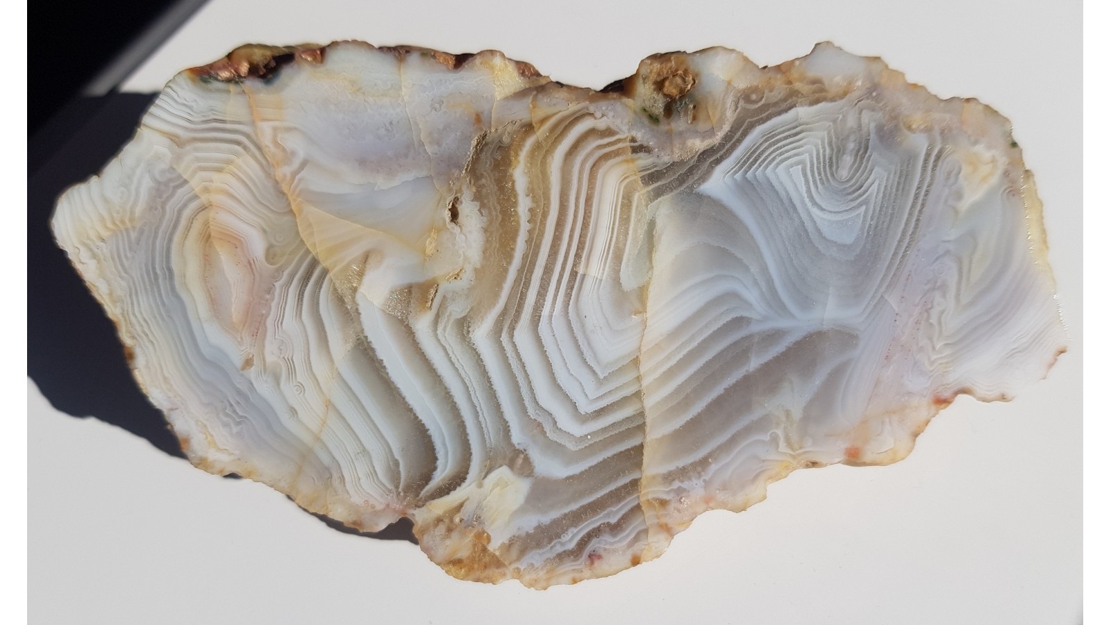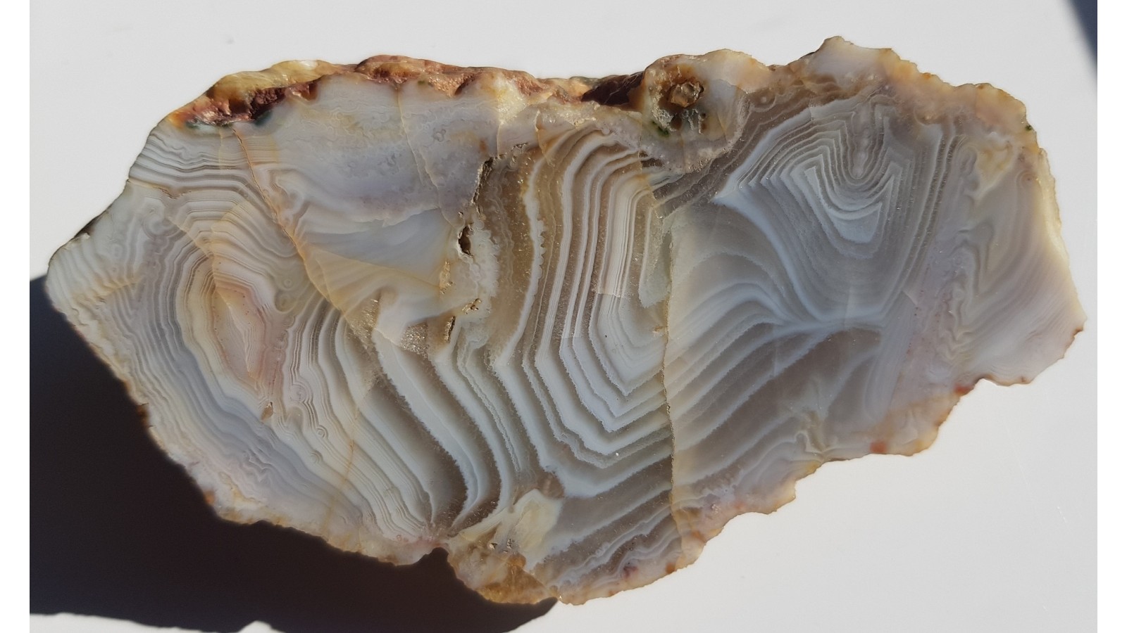 Biały agat z aluwiów Bobru, policentryczny, z pierściniami różnej grubości. Piękny poler, strona przeciwna to naturalny otoczak rzeczny. W rzeczywistości prezentuje się bardzo estetycznie.