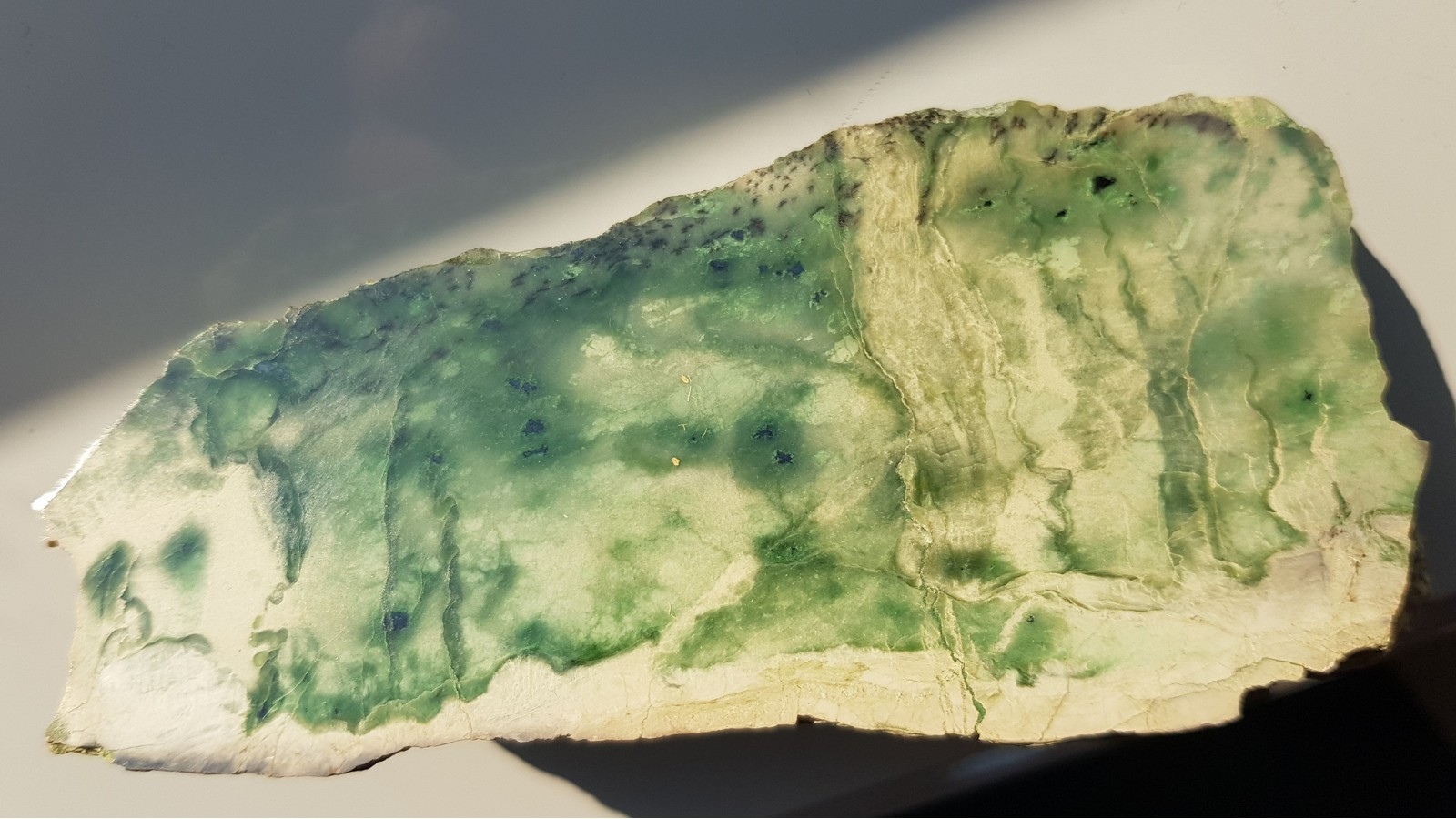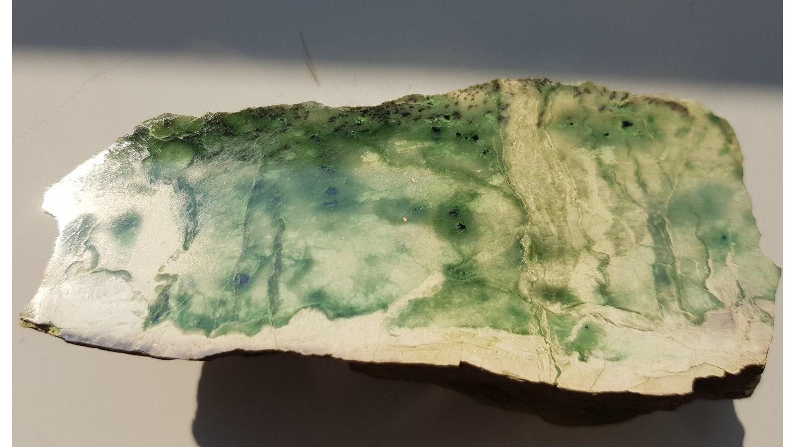 Oferujemy okaz unikatowego nefrytu tremolitowego z Nasławic na Dolnym Śląsku. Niewielka budina w pobliżu jasnej skały rodingitowej została wyeksploatowana w roku 2010 i obecnie nefrytu w Nasławicach całkowiceie brak. Jasna barwa nefrytu z Nasłwic odróżnia go od bardziej powszechnego nefrytu z Jordanowa Śląskiego. Okaz dodatkowo posiada interesujące, widoczne na polerowanym przekroju spinele. Piękna, nasycona barwa nefrytu. Super poler. Unikat do kolekcji mineralogicznej Sudetów.
