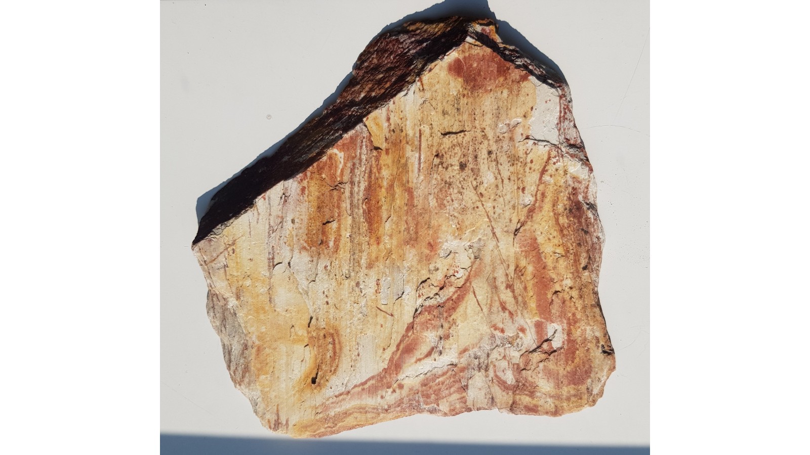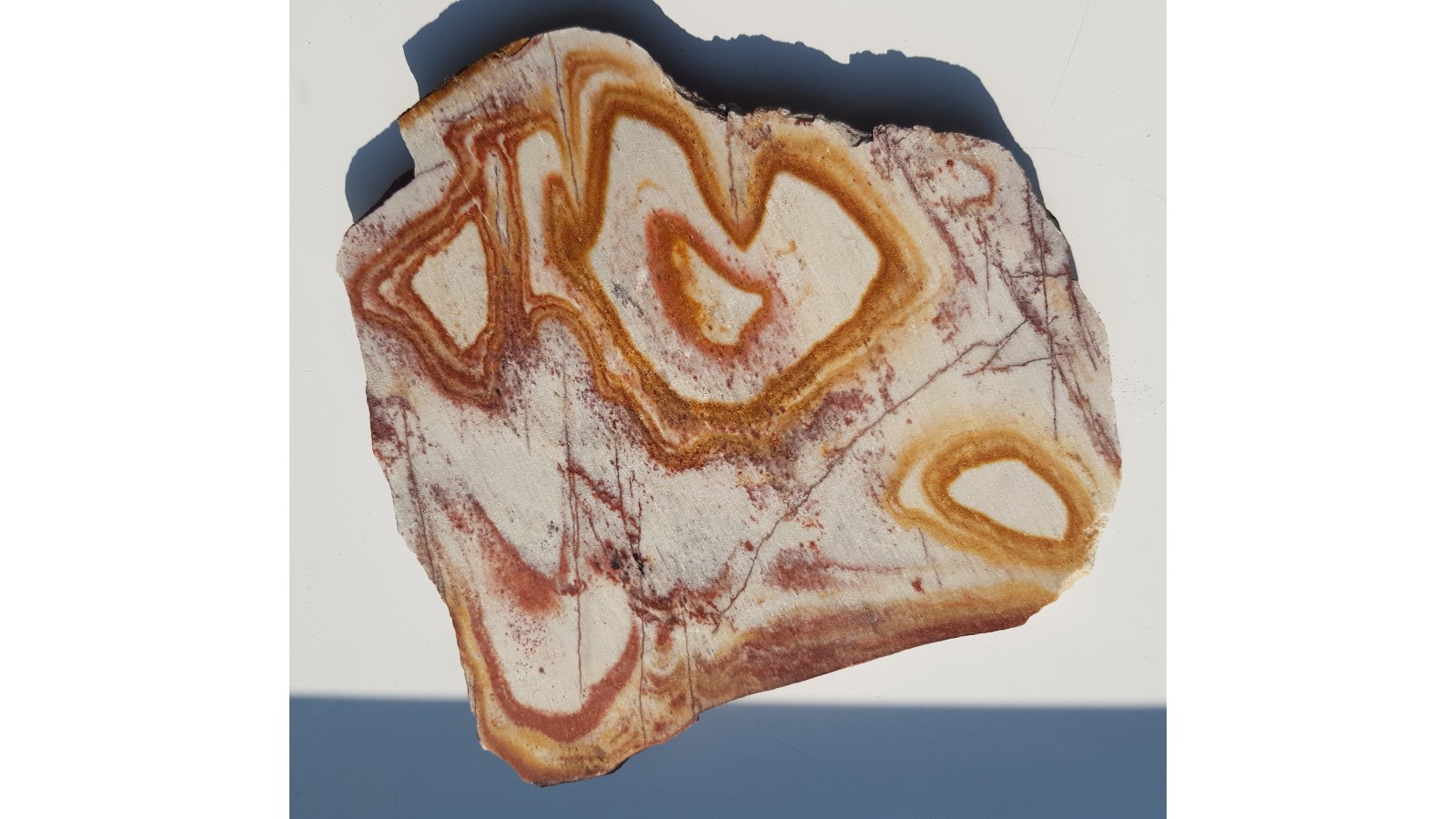 Polerowana płyta łupku kwarcowo-serycytowego z ciekawym, ozdobnym deseniem. Miejscami widoczny efekt awenturescencji. Dotąd nieznana skała ozdobna z osłony masywu strzegomskiego z okolic Żarowa. Skała wykazuje interesujące efekty dekoracyjne i bardzo dobrze przyjmuje poler. Duży, estetyczny okaz. Strona odwrotna naturalna, nie cięta.