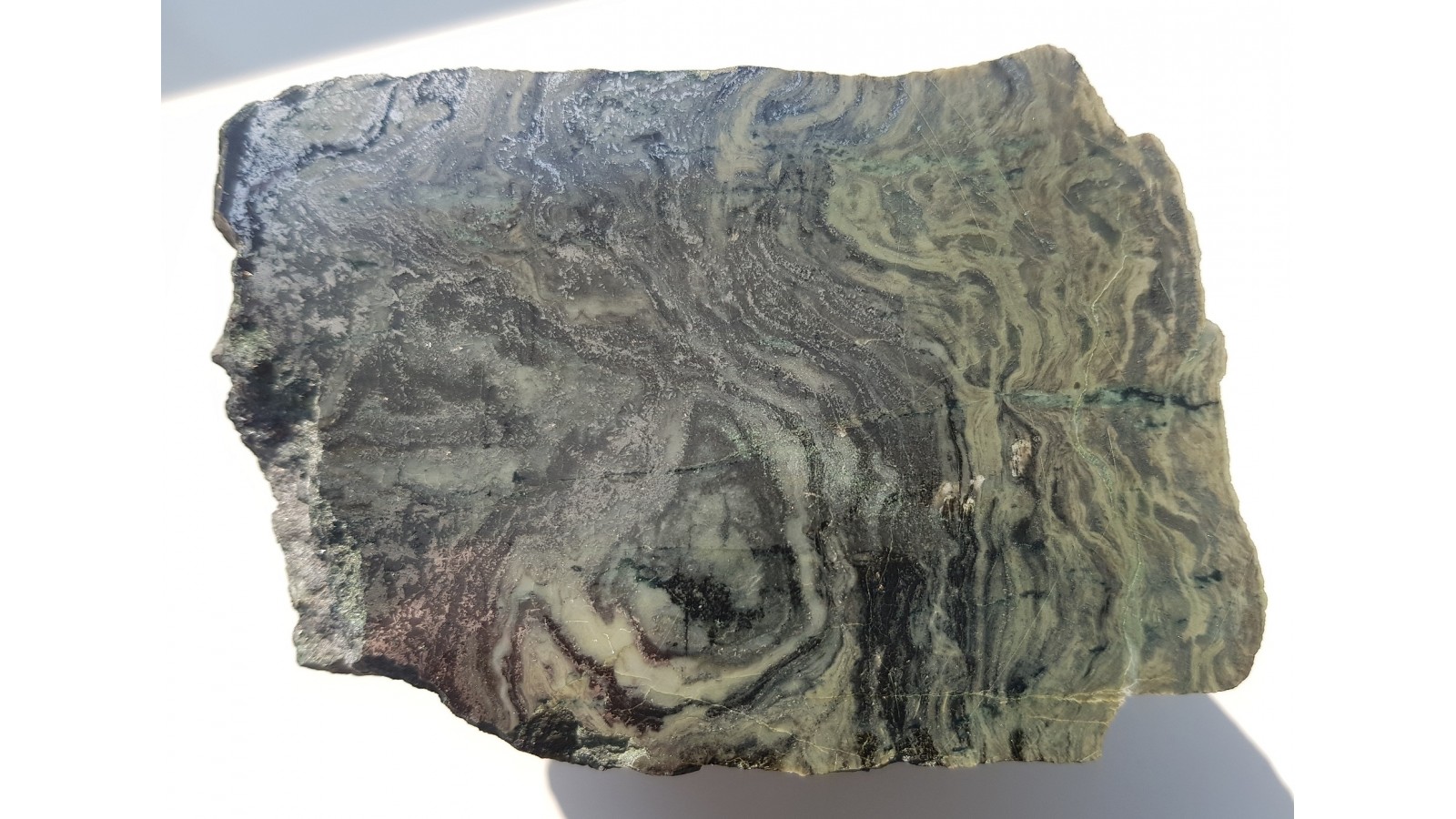 Polerowany okaz skarnu ze Złotego Stoku z pięknym deseniem. Liczne wrostki minerałów rudnych - lellingitu i arsenopirytu. Okaz polerowany.