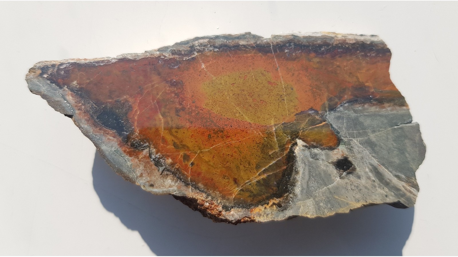 Polerowany okaz jaspisu w naturalnie wypreparowanej z trachybazaltów (melafirów) żyle z Borówna k. Kamiennej Góry. Estetyczny okaz z nieczynnego już kamieniołomu. Strona przeciwna naturalna, nie cięta.