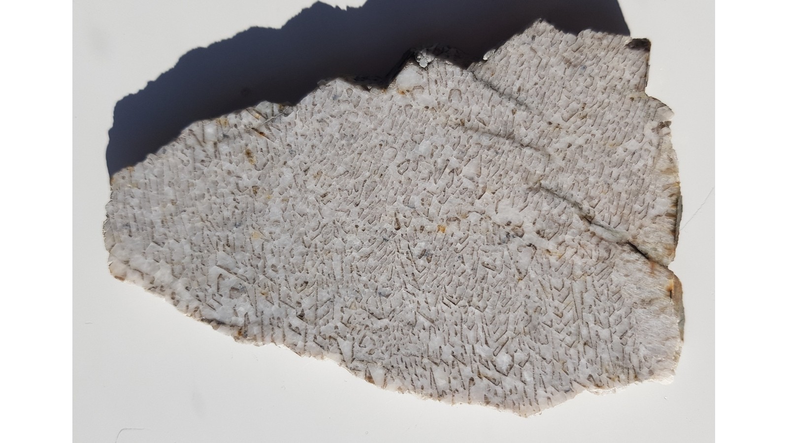Polerowany jednostronnie, wyrazisty okaz kamienia hebrajskiego (mikrogranitu napisowego) z Piławy Grn. w bloku sowiogórskim. Okaz wyróżnia się drobną, delikatną strukturą napisową, jednak mimo tego jest ona wyraźna. Piękny okaz do kolekcji kamieni ozdobnych Sudetów. Polecam.