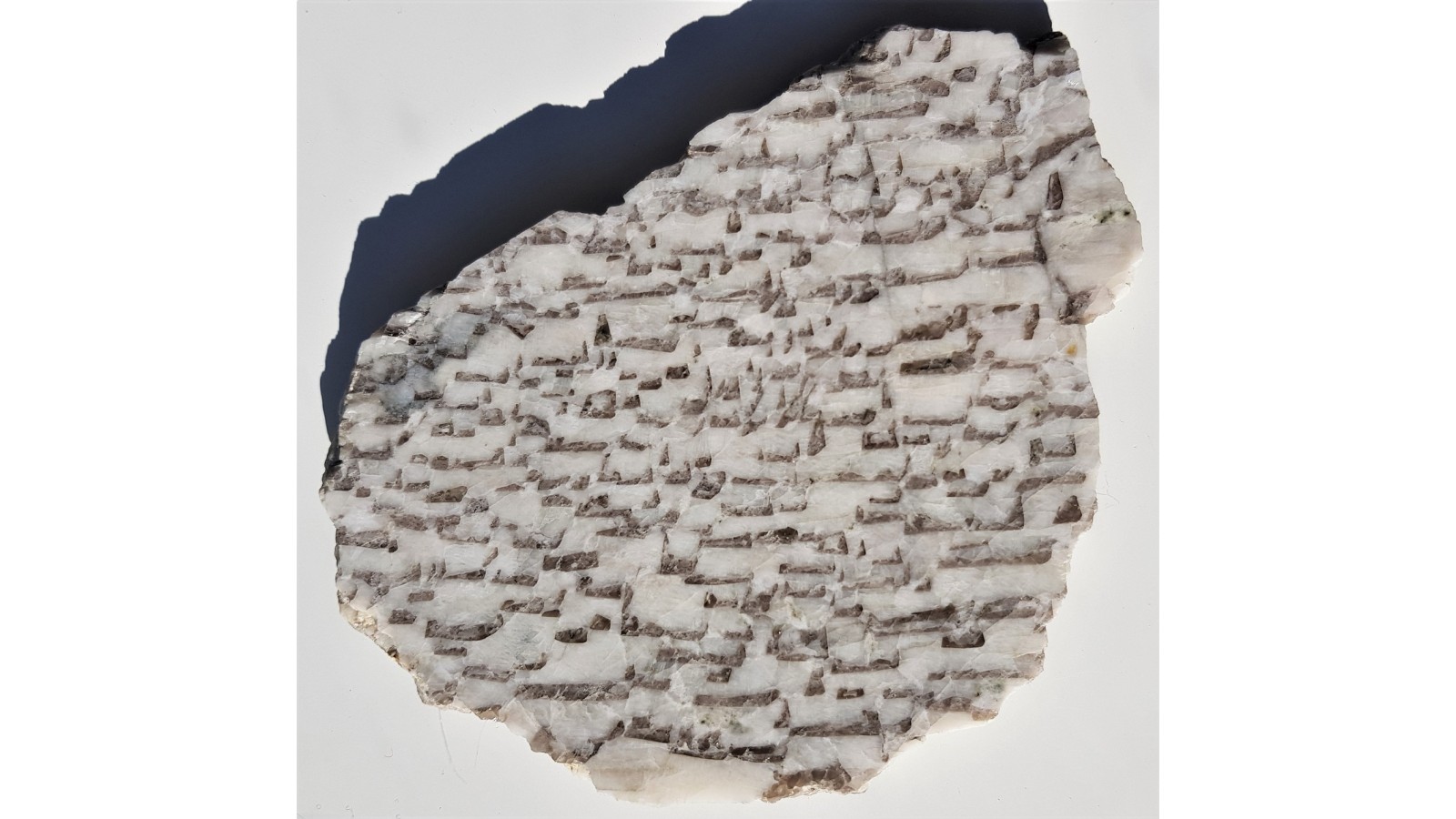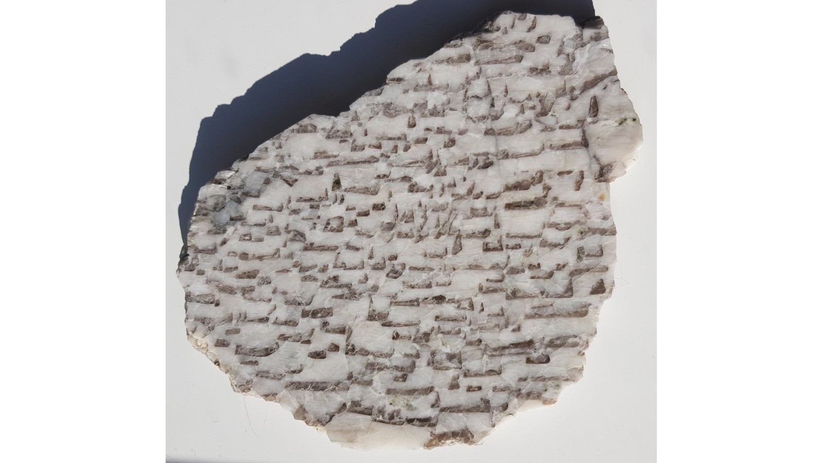 Polerowany jednostronnie, wyrazisty okaz kamienia hebrajskiego (granitu napisowego) z Piławy Grn. w bloku sowiogórskim. Piękny okaz do kolekcji kamieni ozdobnych Sudetów. Polecam.