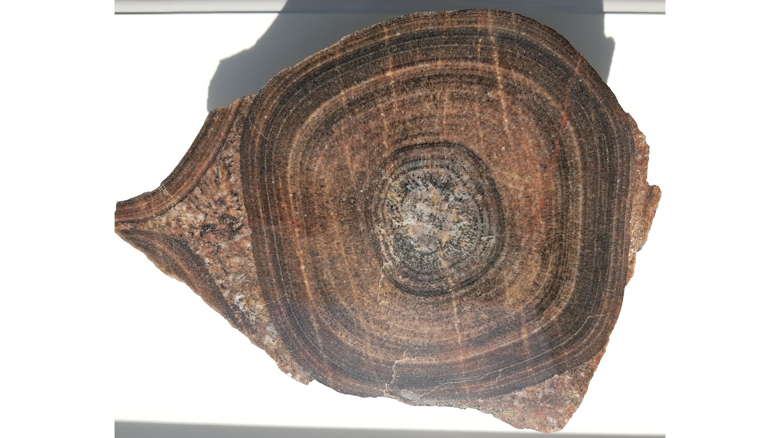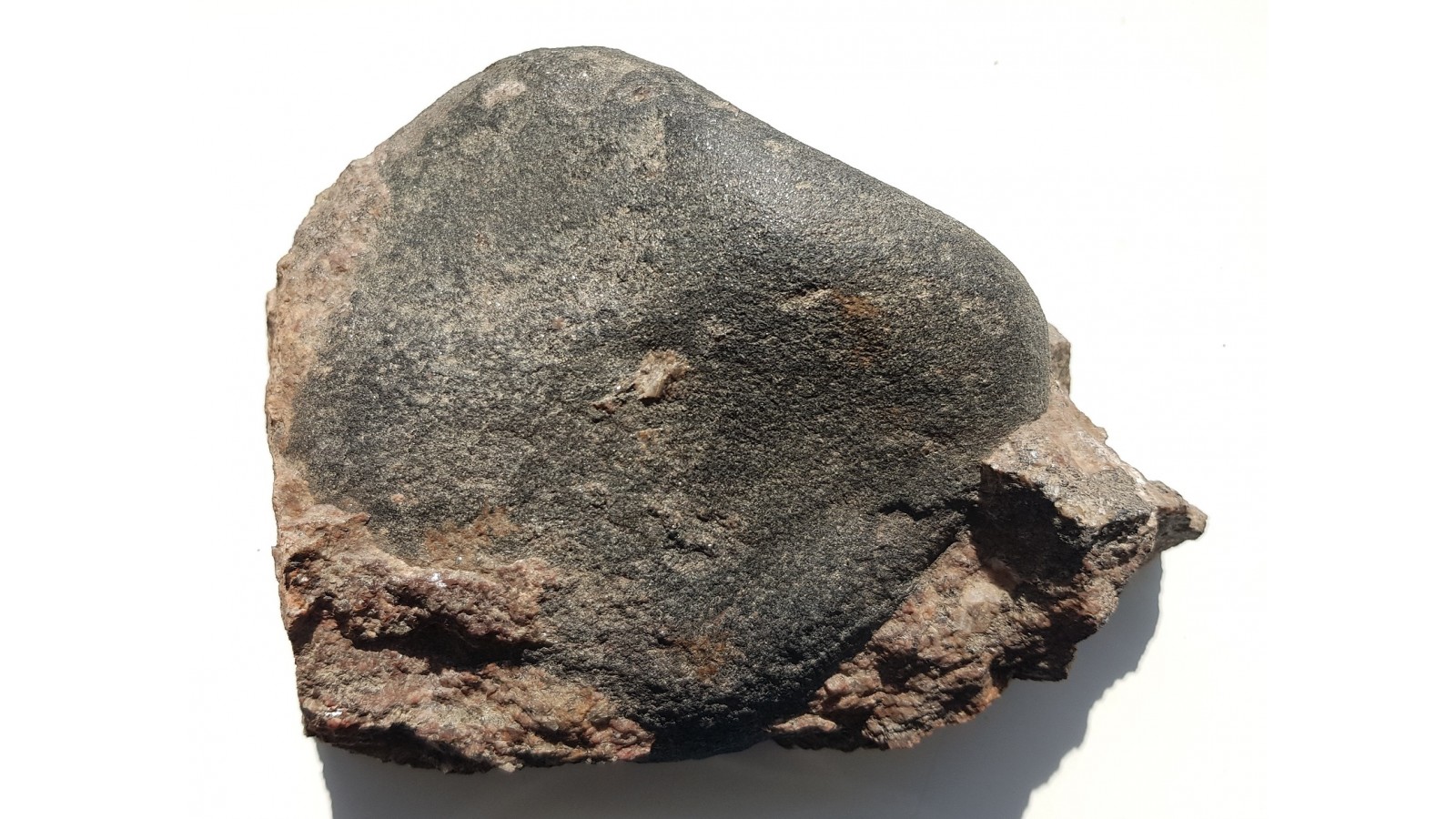 Piękny, polerowany z najwyższą starannością okaz granitu orbikularnego z południowej Finlandii. Orbikula pięknie zachowana, bez pęknięć, na zewnątrz cała, obła forma. Duży okaz, sama kula ma 15 cm średnicy. Rzadkość petrologiczna.
