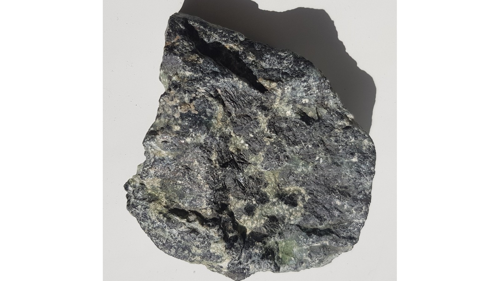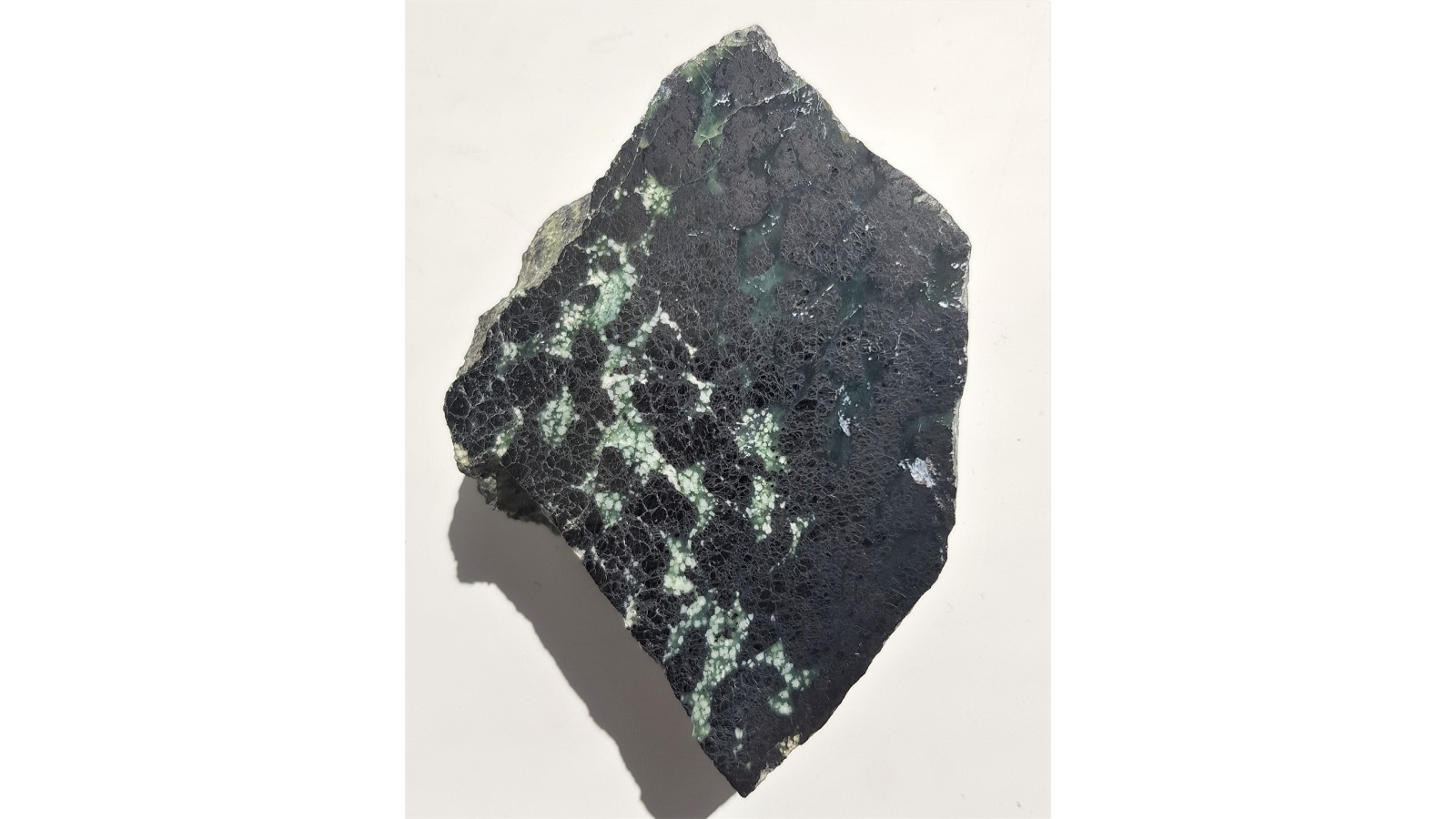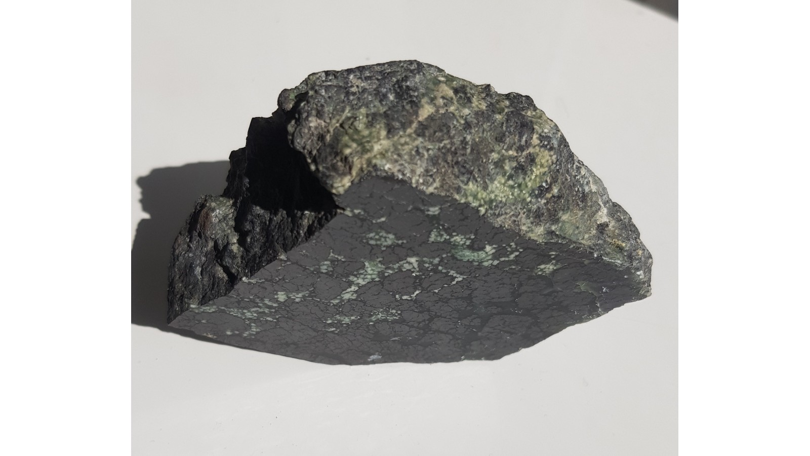Bryłka rudy chromitowej z wtopionymi w przeświecający serpentynit (ofit) kryształami chromitu. Jednostronnie polerowana. Strona przeciwna nie cięta, naturalna.