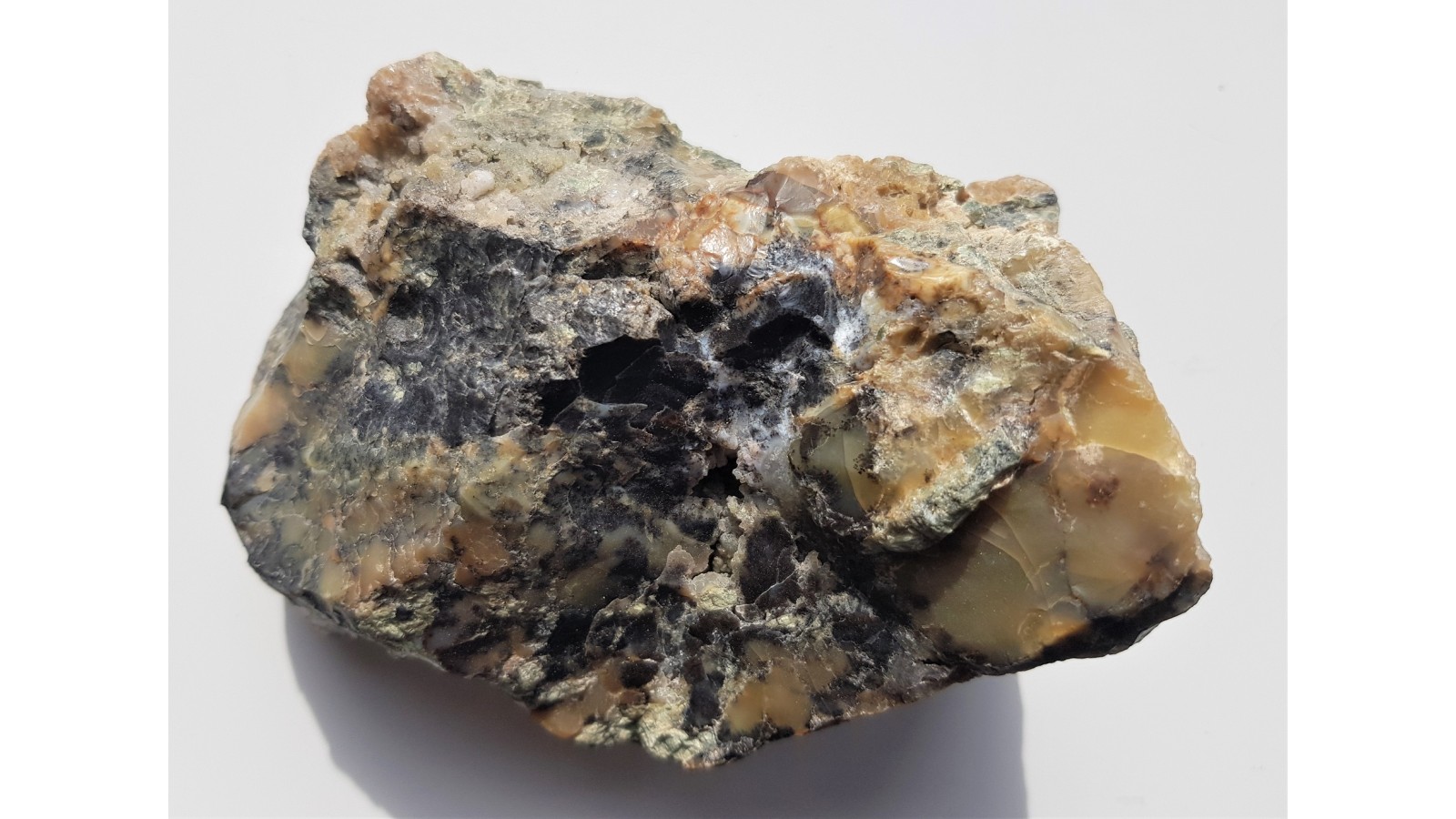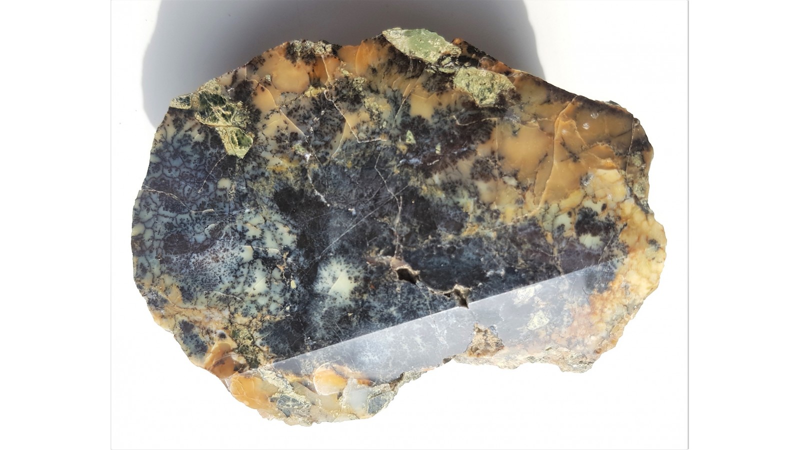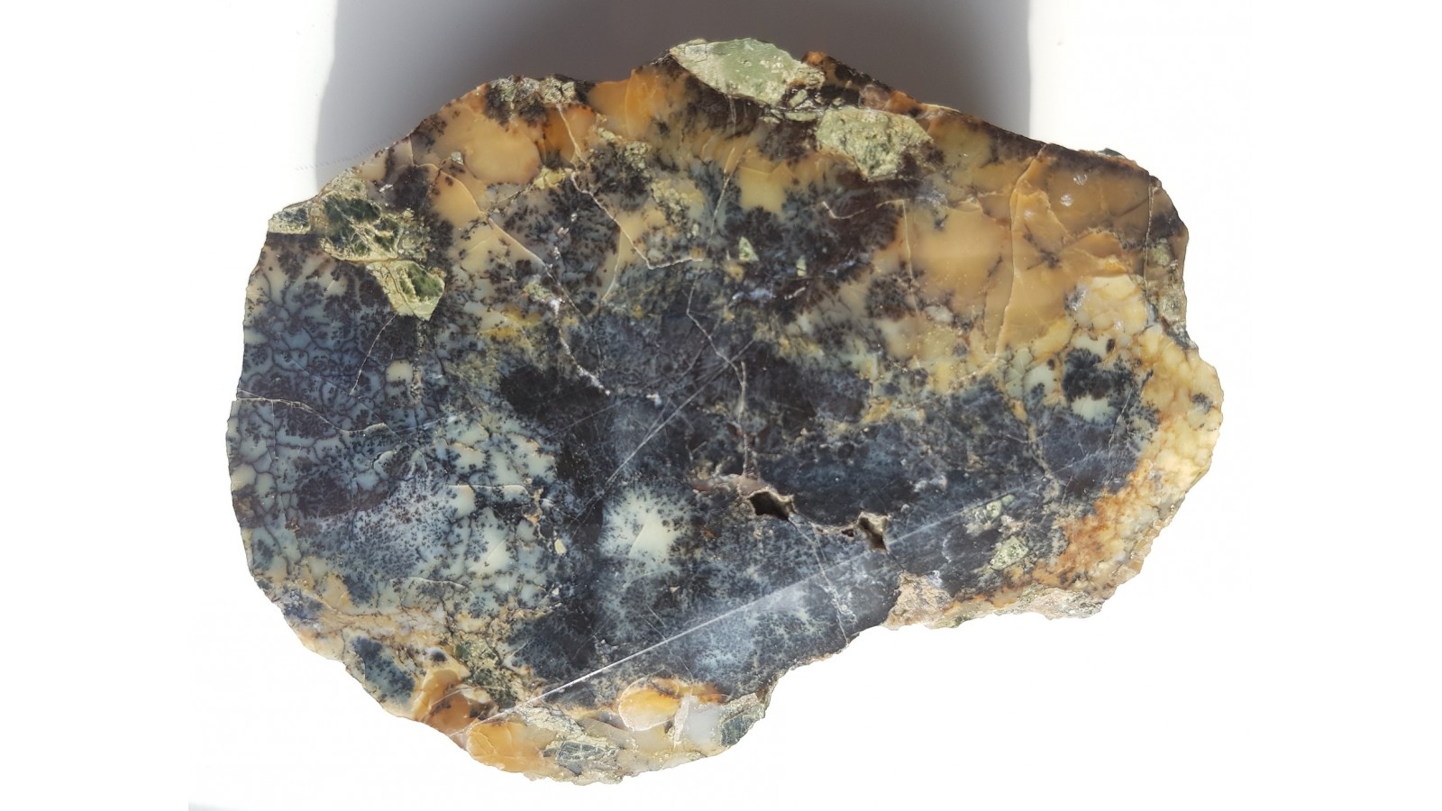 Polerowany okaz opalu dendrytowego z Nasławic. Dosyć duży okaz w barwach czarno, biało, miodowych. Piękny poler. Bardzo estetyczny okaz. Po zejściu z eksploatacją na niższe poziomy opale występujące w strefie wietrzenia serpentynitów są bardzo trudno osiągalne. Okaz sprzed co najmniej 20-tu lat.