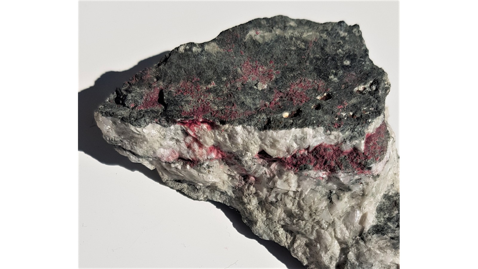 Okaz rzadkiego minerału wtórnego kobaltu - erytrynu. Powłoki erytrynu w postaci bardzo licznych, drobnych kulistych skupień igiełek erytrynu o bardzo wyrazistej barwie. Powłoki erytrynu na rozproszonych w żyle kalcytowej pierwotnych minerałach rudnych kobaltu. Okaz z rejonu Miedzianki sudeckiej, z dawnych hałd pogórniczych. Ładny, duży okaz. Rzadkość mineralogiczna w Sudetach.