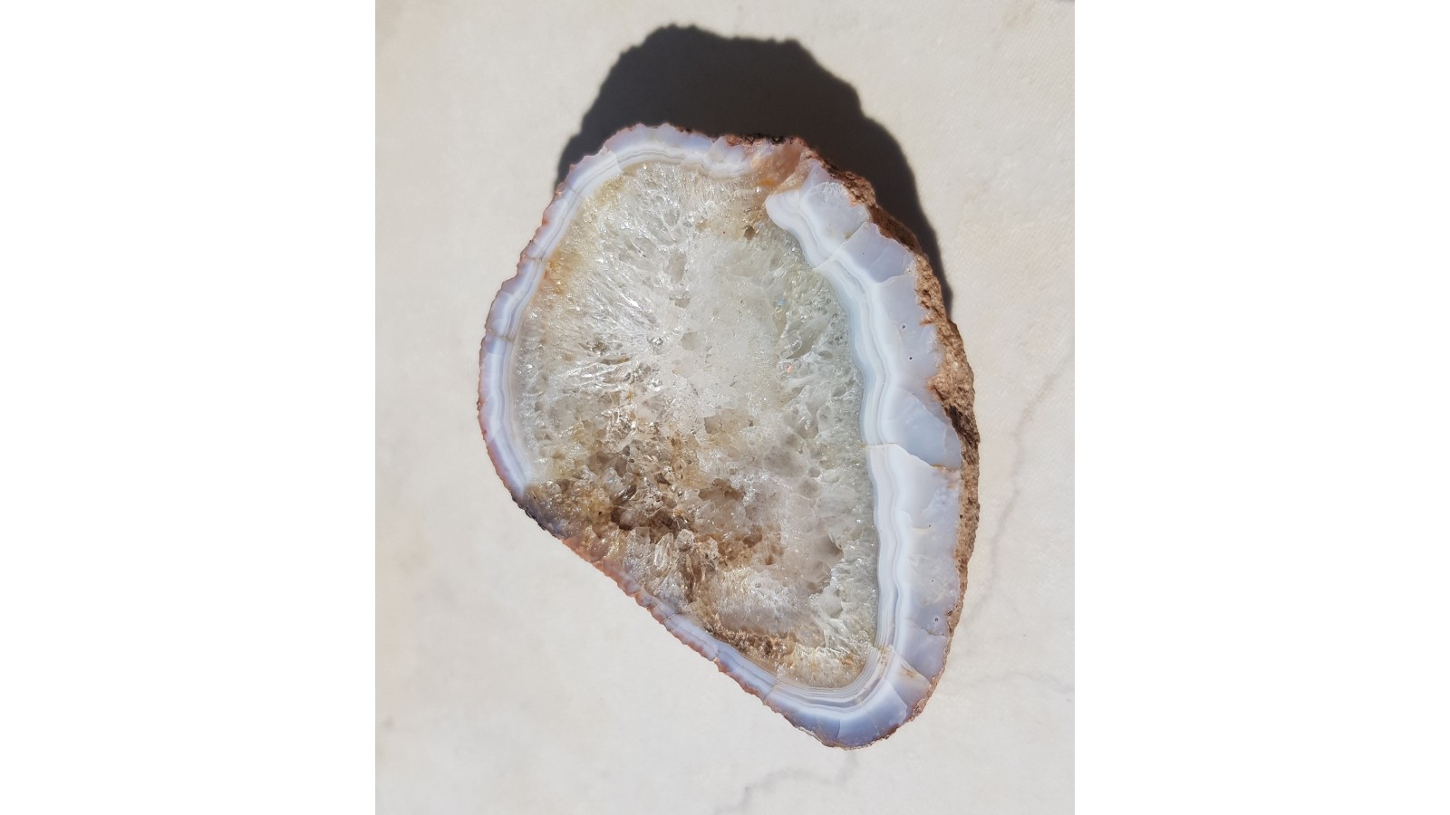 Agat z aluwiów rzeki Ścinawki ze strefą krustalną zbudowaną z kwarcu. Agat w odcieniach bieli. Piękna forma, z tzw. wlewką, z tyłu naturalna powierzchnia geody. Rzadka lokalizacja.
