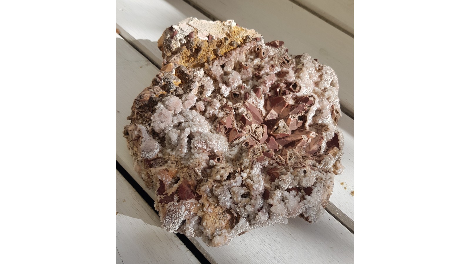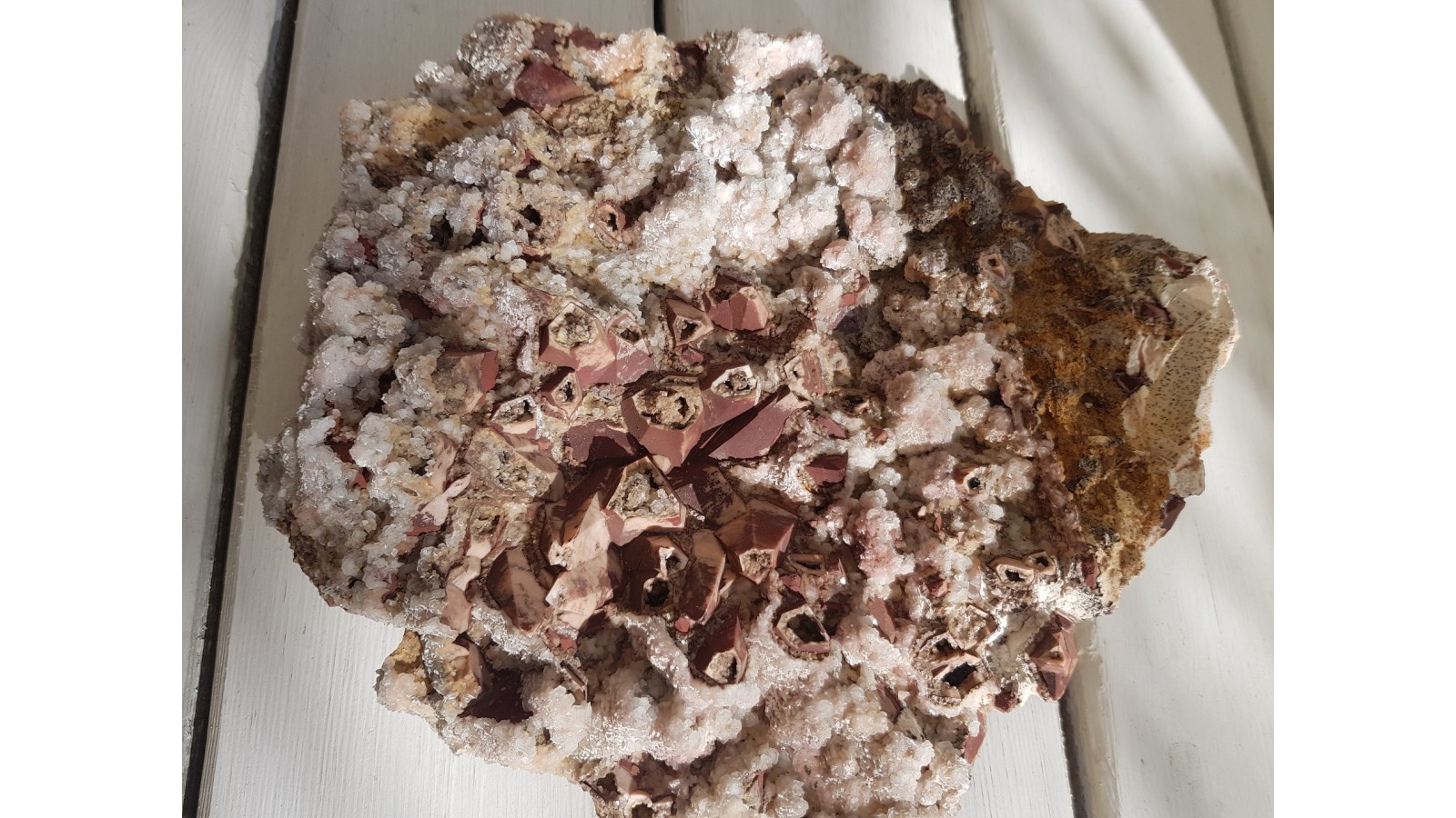 Klasyczny minerał z kamieniołomu dolomitu w Rędzinach k. Kamiennej Góry - pseudomorfozy dolomitu po kalcycie. Obecny także kalcyt w postaci drobniejszych gron obrastających dolomit oraz hematyt. Duży, spektakularny okaz. Polecam.