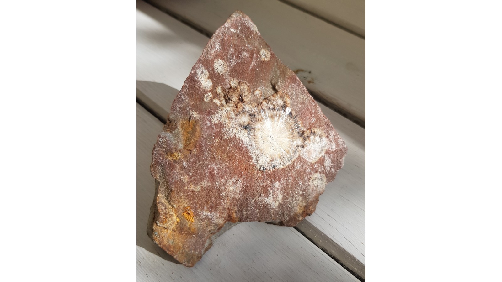 Piękna, duża rozeta wavellitu na kambryjskim kwarcycie z Wiśniówki w Górach Świętokrzyskich. Sama rozeta ma 4 cm średnicy. Okaz sprzed wielu lat. Polecam.