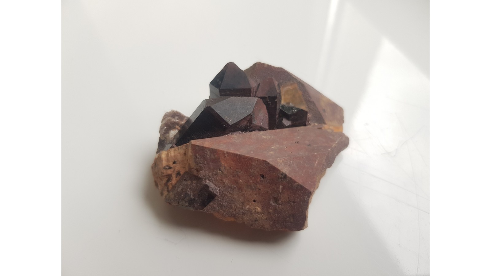 Idealnie czarne moriony z połyskiem na skaleniu potasowym. Okaz z pegmatytów karkonoskich z okolic Jeleniej Góry. Kryształy morionu pięknie wykształcone, z całymi zakończeniami. Szczotka niewielka, lecz bardzo estetyczna. Polecam.
