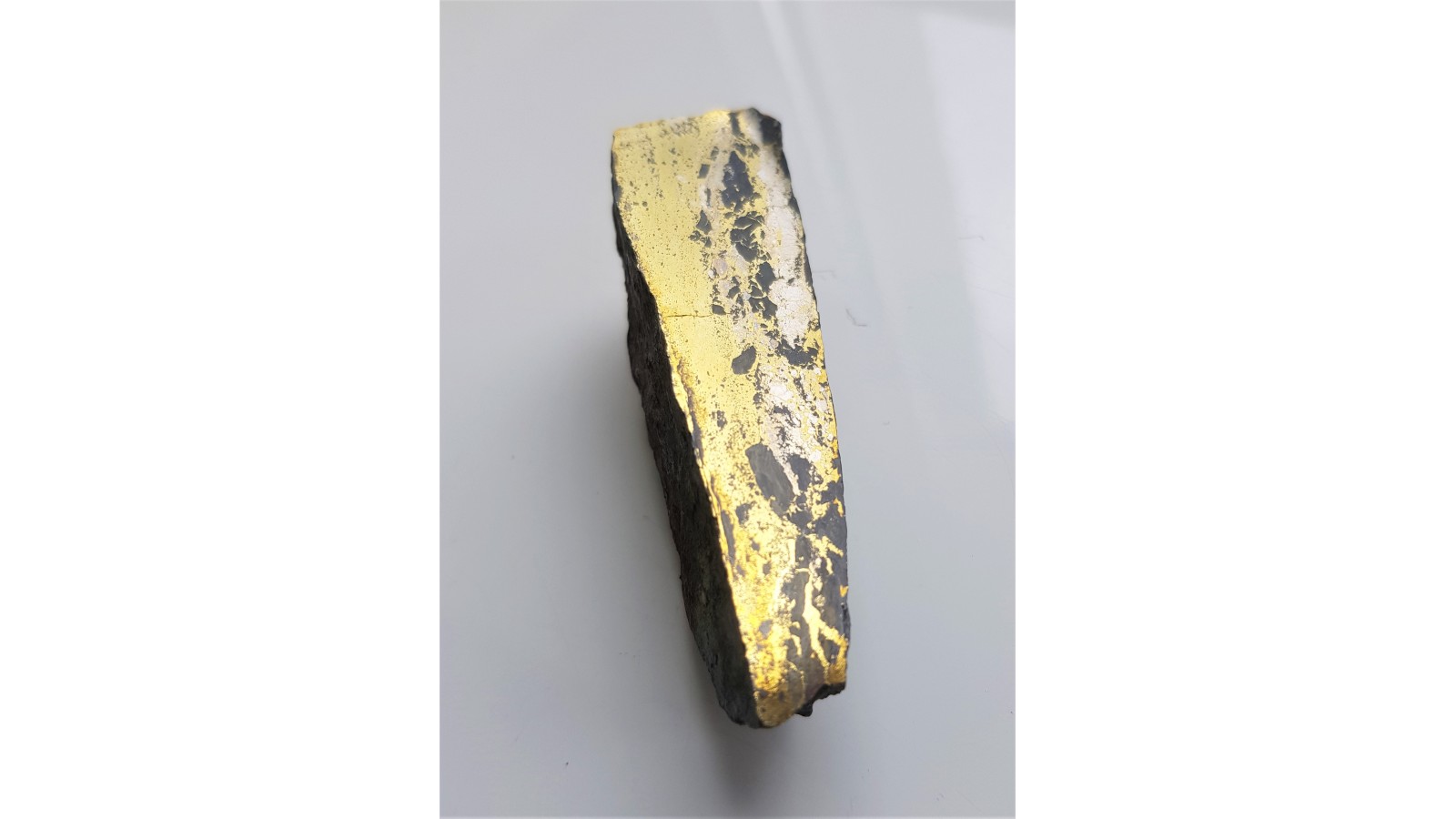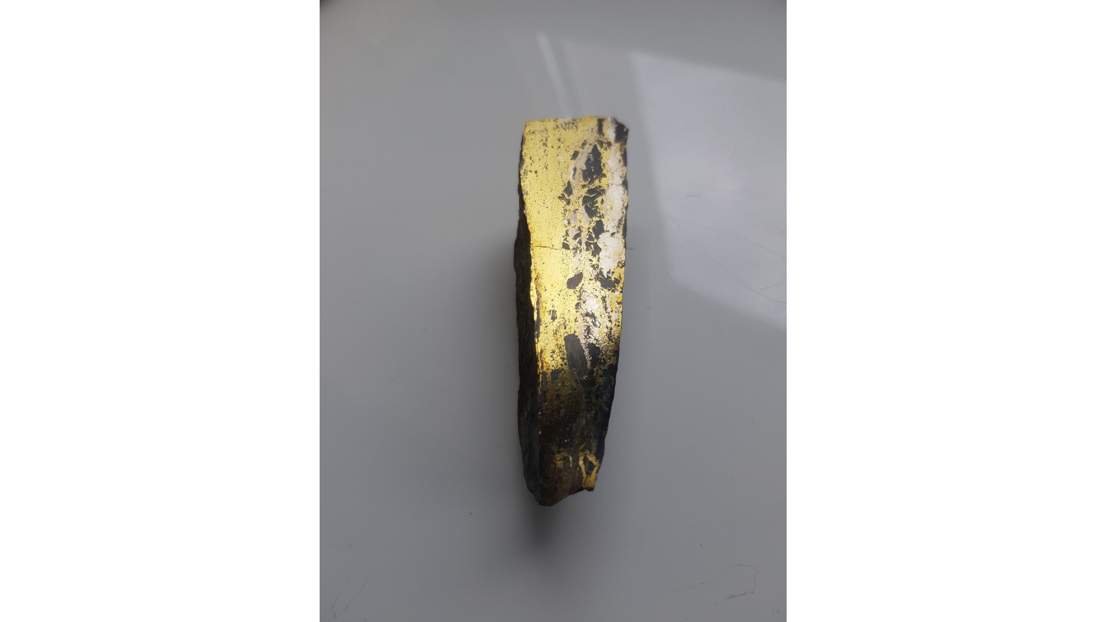 Przekrój przez żyłę kruszcową z chalkopirytem z Miedzianki. Duża zawartość minerałów rudnych. Piękny poler. Strona odwrotna naturalna, nie cięta. Polecam.