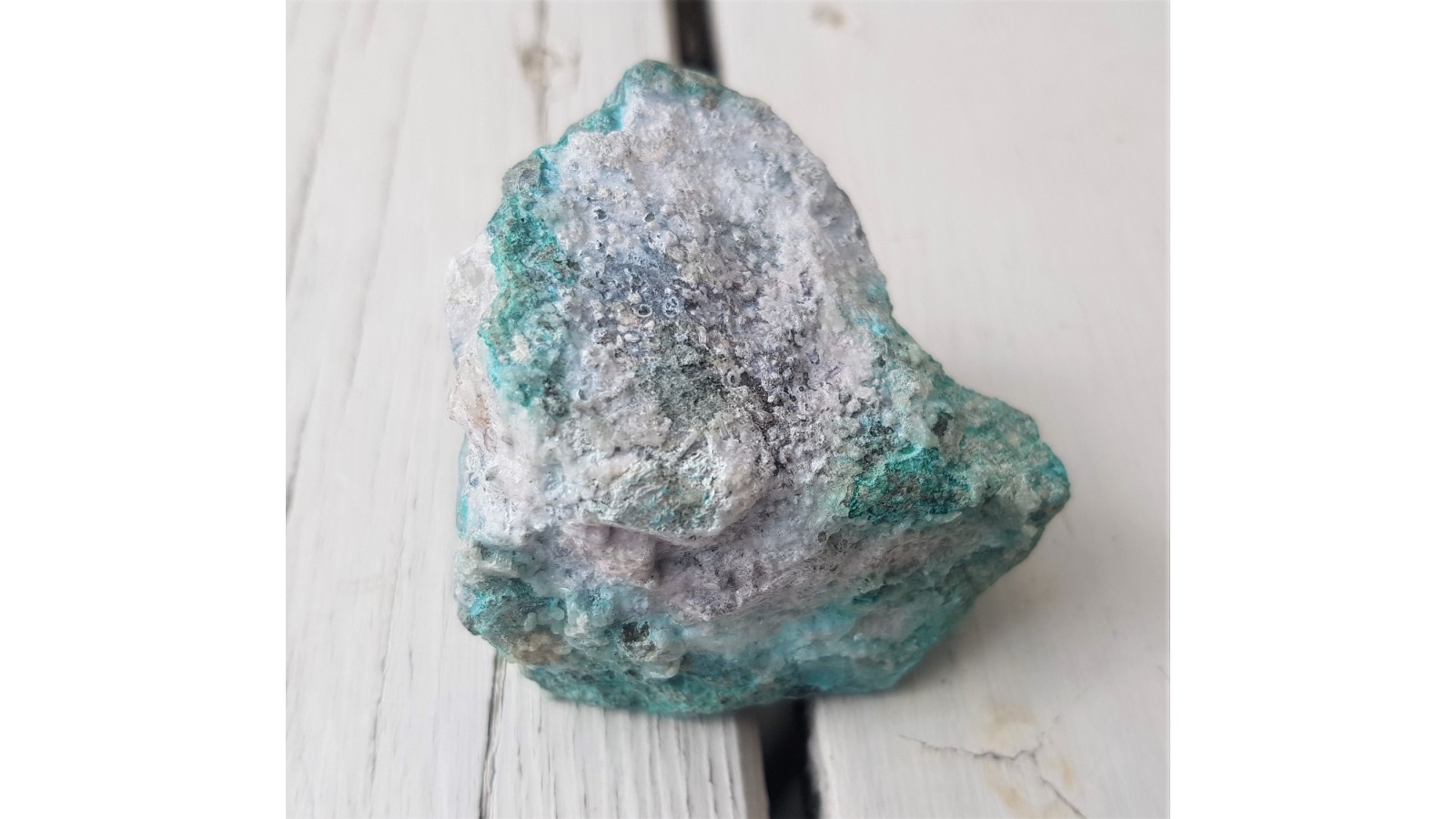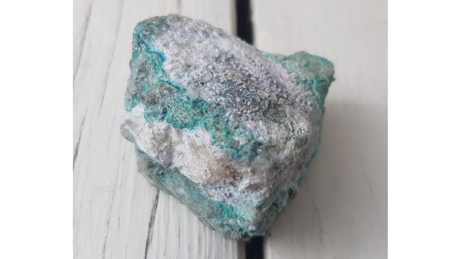 Śnieżnobiały hydrocynkit razem z chryzokolą oraz gipsem jako powłoki na łupkach amfibolowych ze złoża rud z Ciechanowic k. Miedzianki sudeckiej. Ciekawostka mineralogiczna do kolekcji regionalnej.