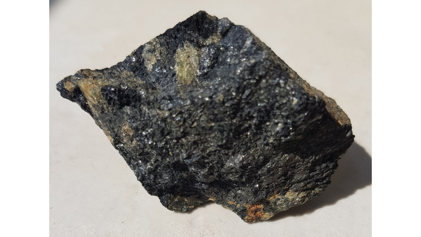 Okaz pegmatytu hornblendowo-apatytowego z Bystrzycy Górnej w bloku sowiogórskim. Pegmatyt datowany na podstawie wieku hornblendy na 1 mld. 340 mln lat (prekambr) (prof. M. Sachanbiński, 1973). Widoczne jasnozielone skupienie apatytu. Niewielki okaz.