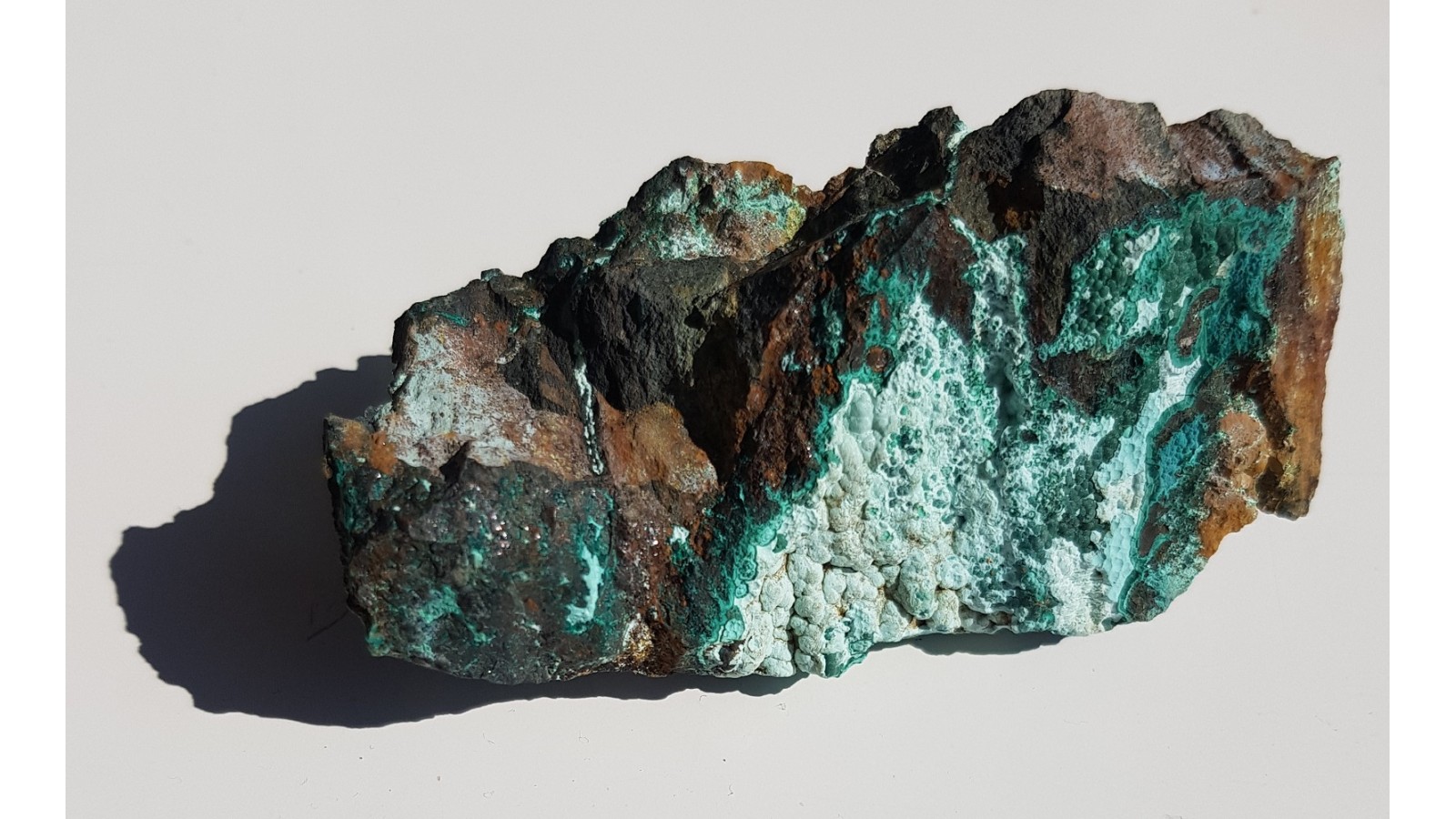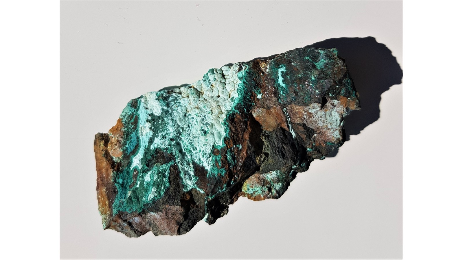 Botryoidalne, naciekowe skupienie malachitu, a zapewne także innych wtórnych minerałów miedzi z Miedzianki w Sudetach. Estetyczny okaz z charakterystycznymi groniastymi skupieniami. Polecam.
