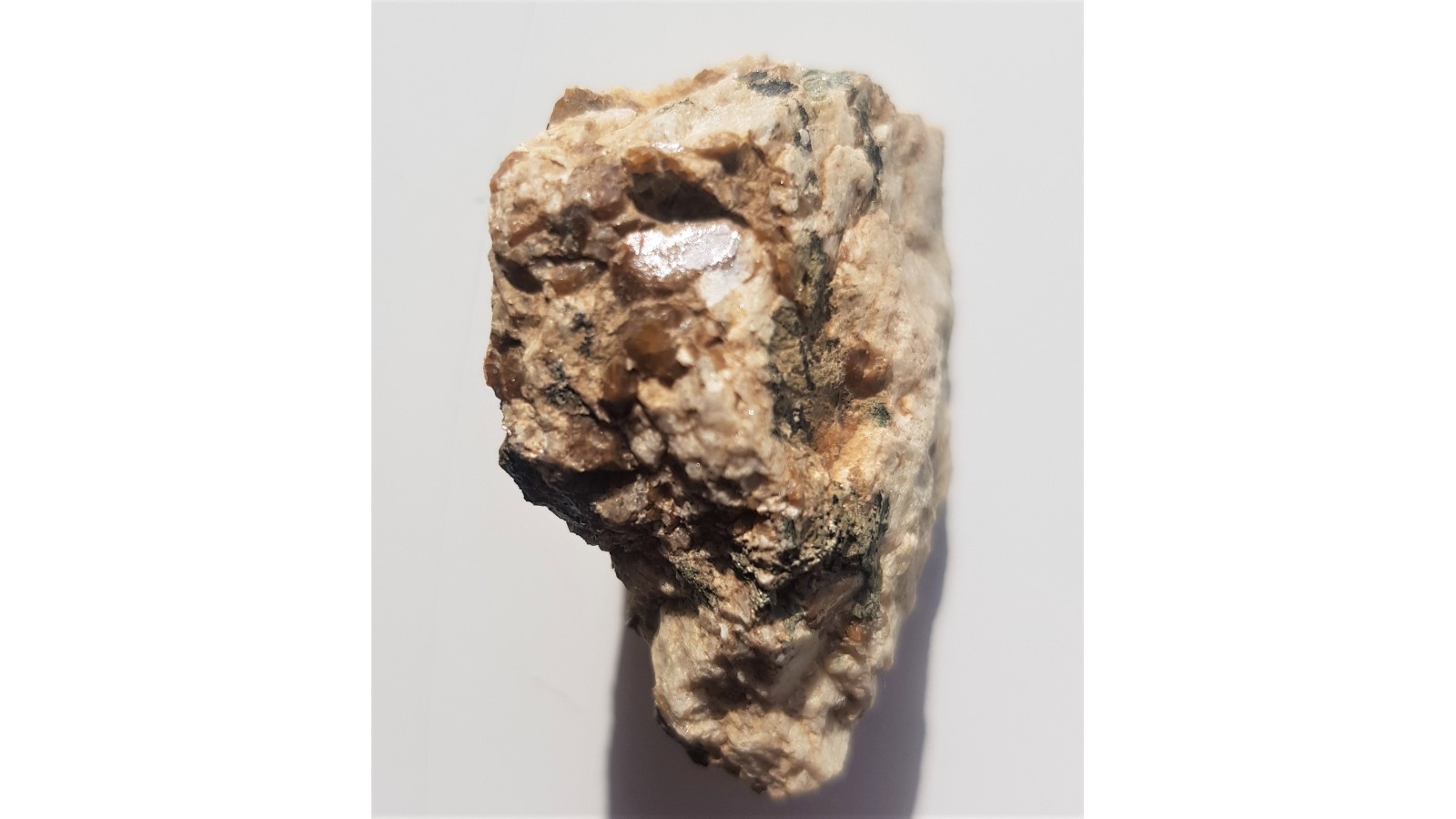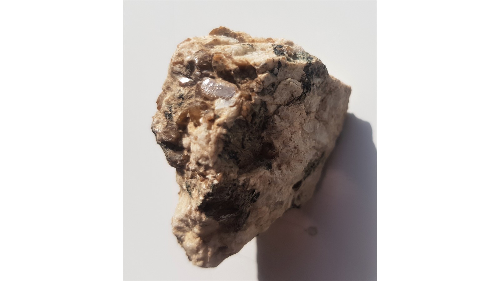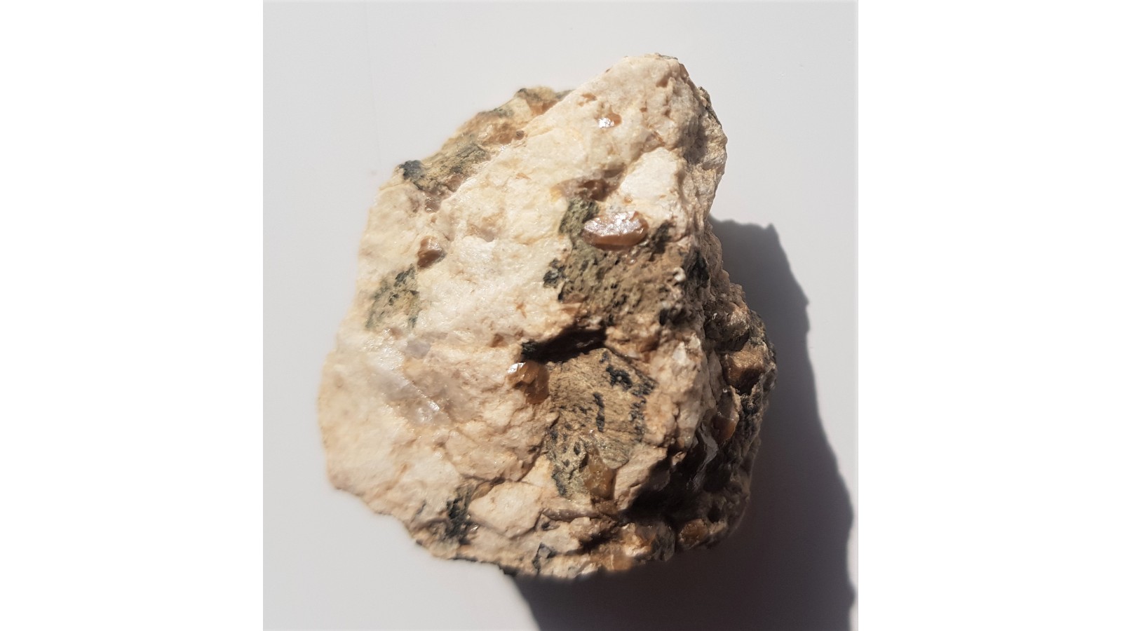 Skupienie kopertowo wykształconych kryształów tytanitu o diamentowym połysku. Kryształy w matriks - skale przypominającej pegmatyt, wyjątkowo grubokrystalicznej strefie w granulitach bądź eklogitach. Kryształy wspaniale wykształcone, barwy miodowej, nie przeobrażone, o bardzo silnym połysku. Wiele kryształów w jednej próbce. Największy ok. 7 mm. Unikatowa próbka. Okaz z obszaru bloku sowiogórskiego z okolic Bielawy.