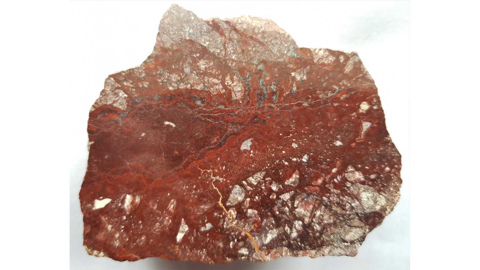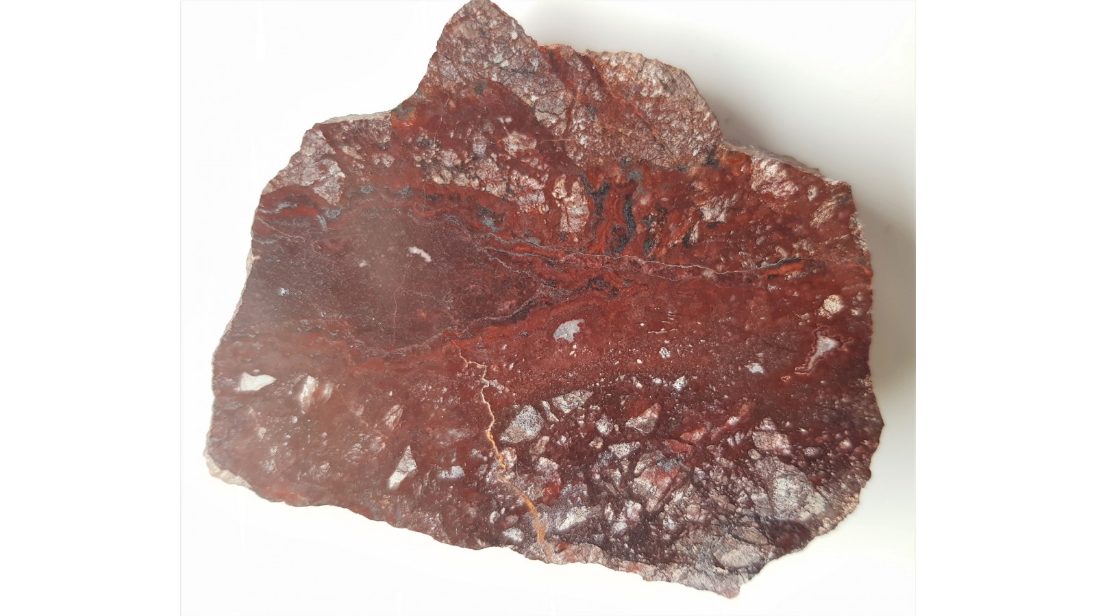 Polerowany fragmant żyły ankerytowej z kopalni Wilcza k. Stanisławowa. Żyła w całości wypełniona masywnym, czerwonym ankerytem z ładnym deseniem.
