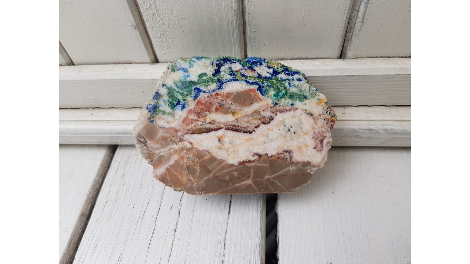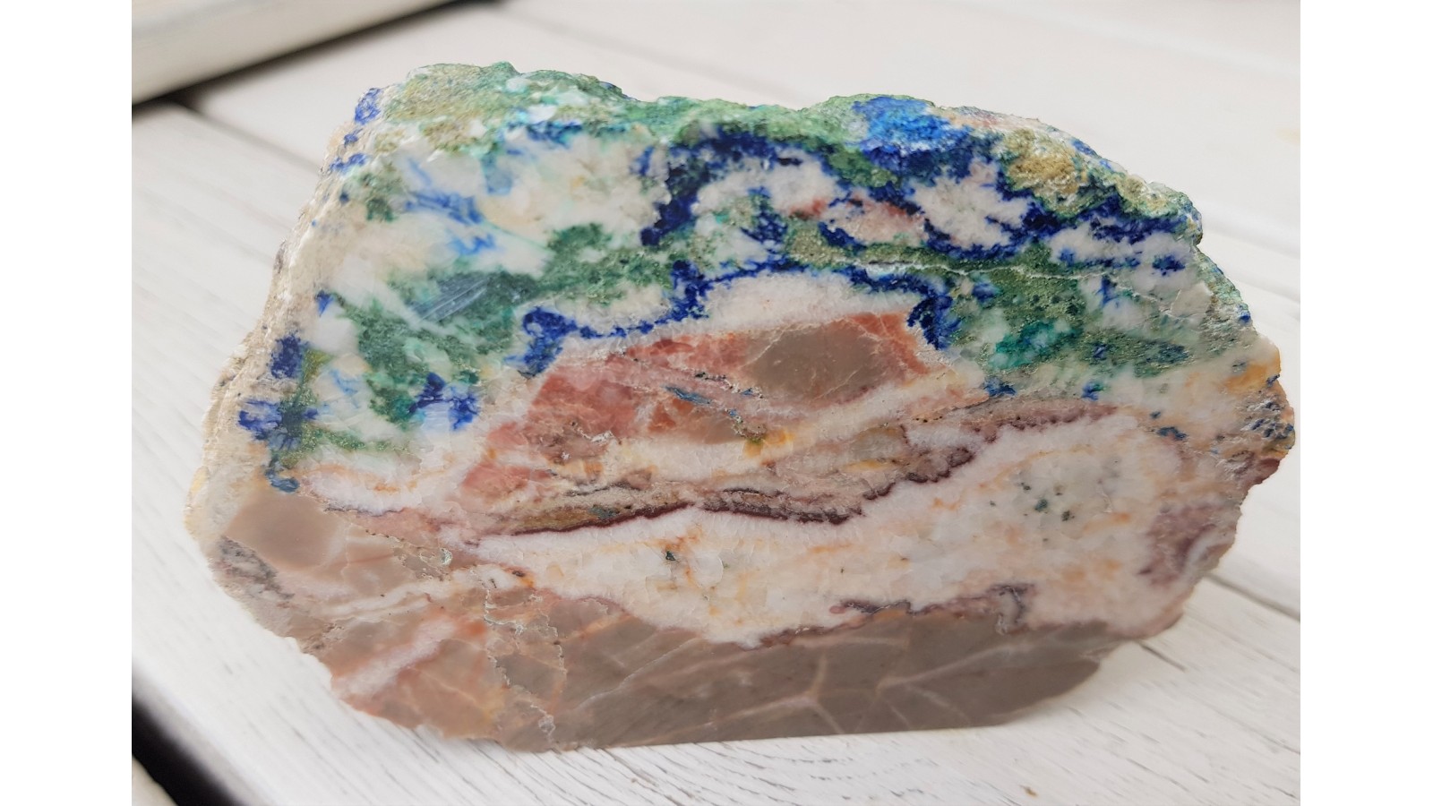 Polerowany okaz różanki świętokrzyskiej z Miedzianki k. Kielc pięknie zmineralizowany malachitem i azurytem. Spory, bardzo estetyczny okaz o wyrazistej teksturze. Różanka jest zespoloną kalcytem brekcją tektoniczną z charakterystycznym deseniem nadanym przez dewońskie wapienie jak i późniejszą mineralizację. Strona przeciwna naturalna, nie cięta.