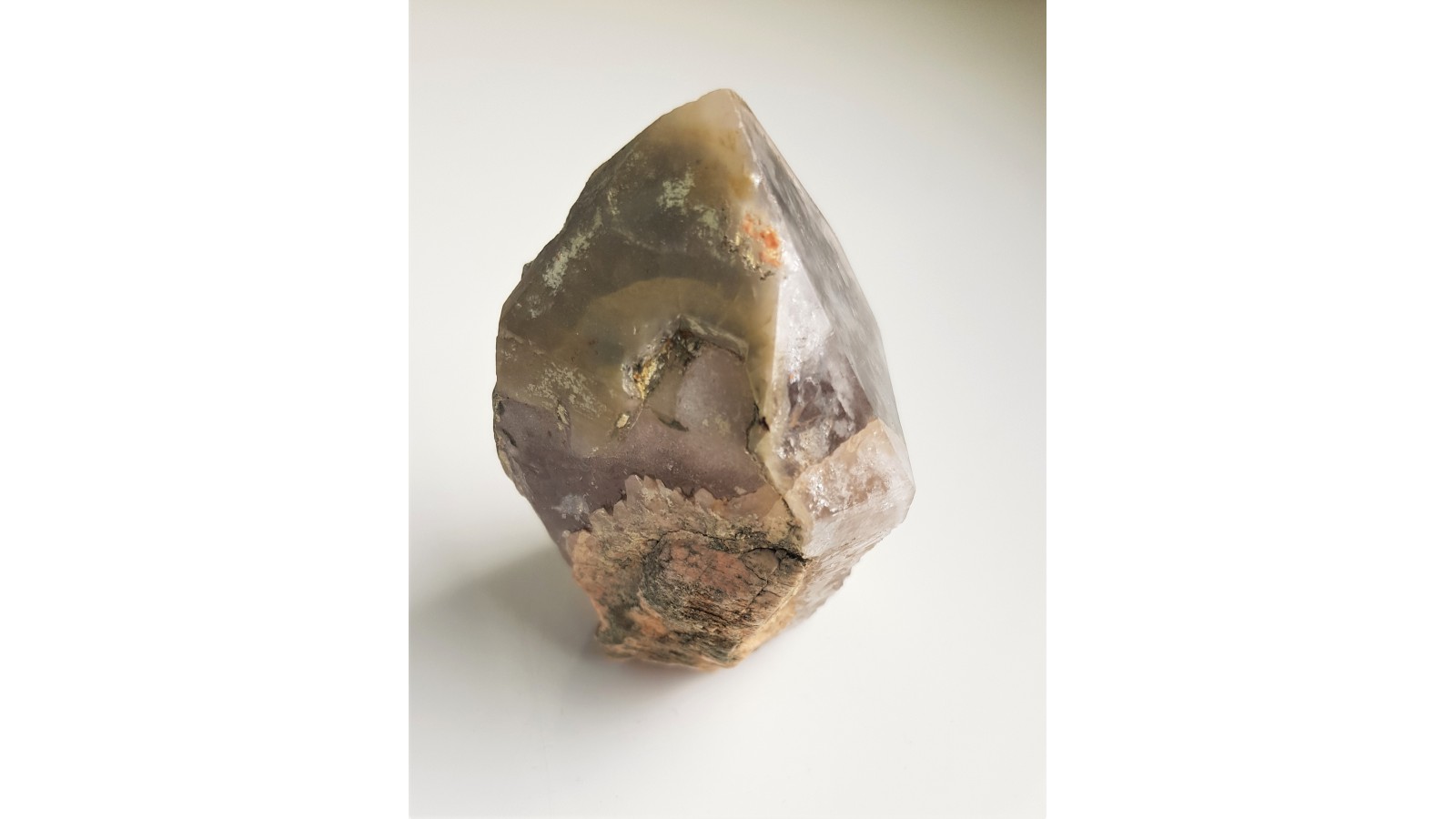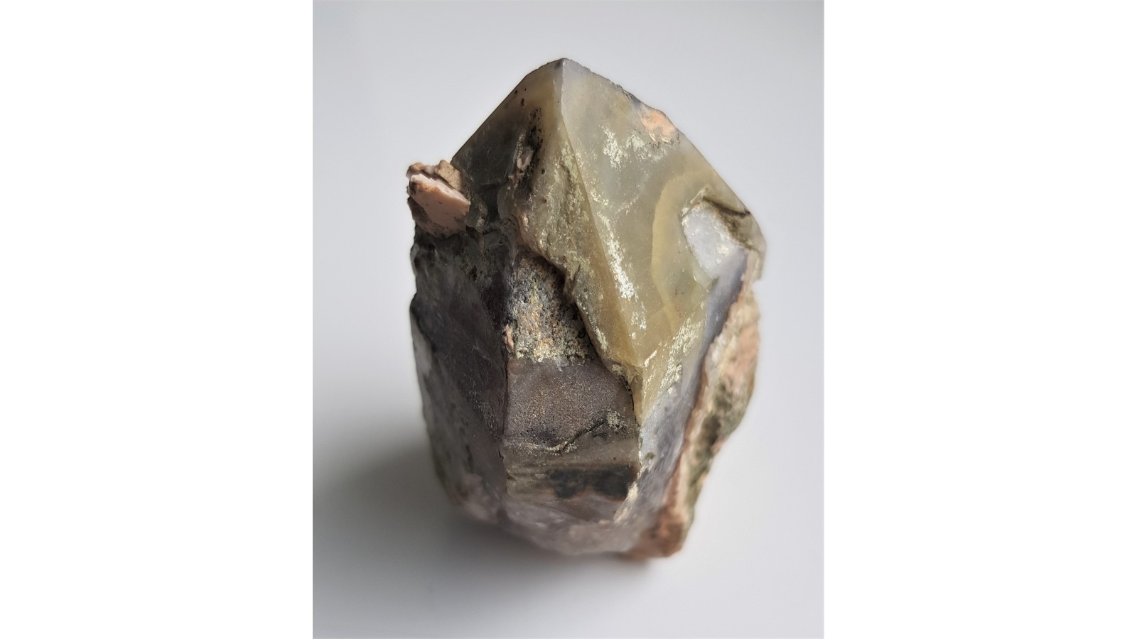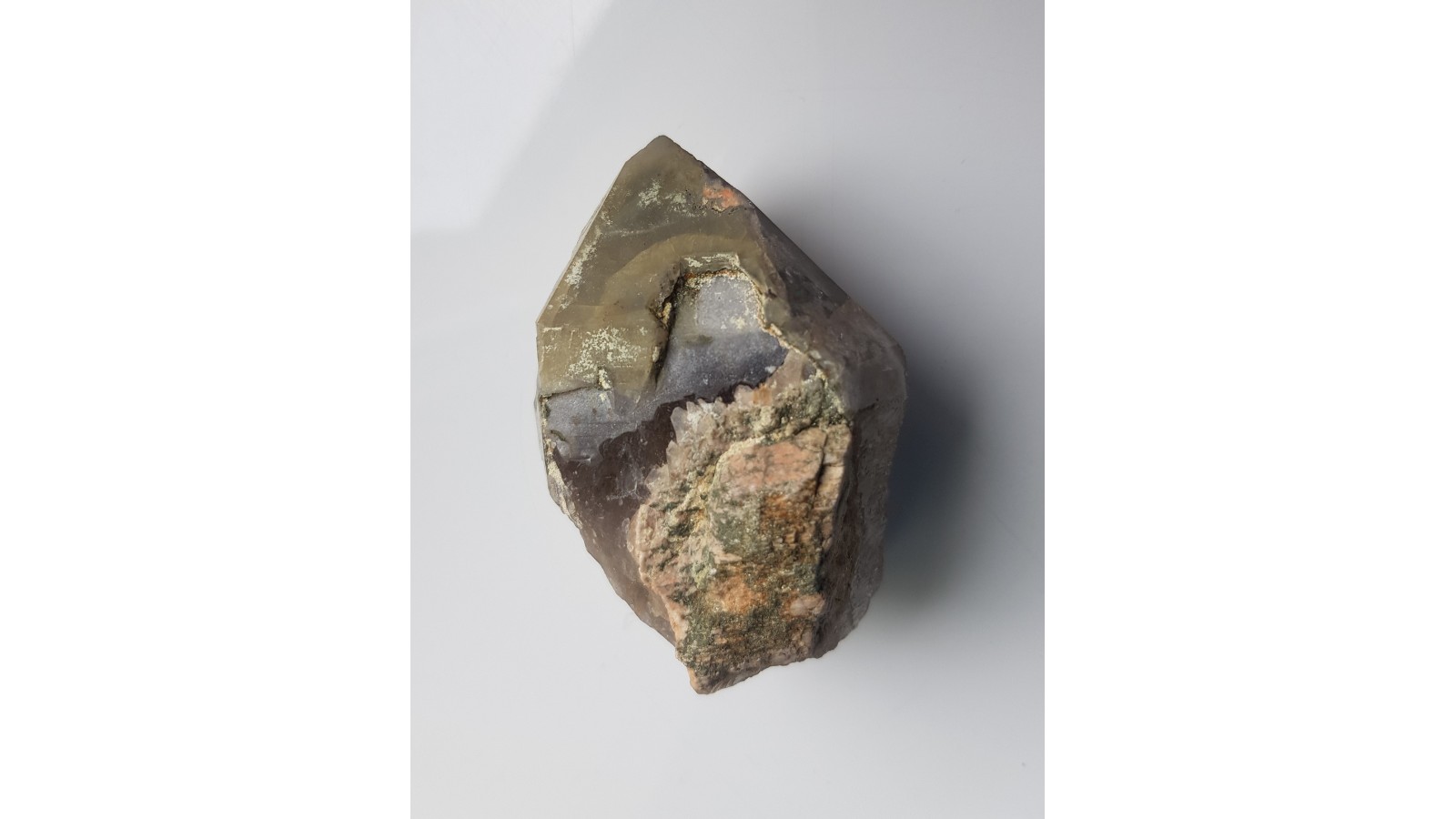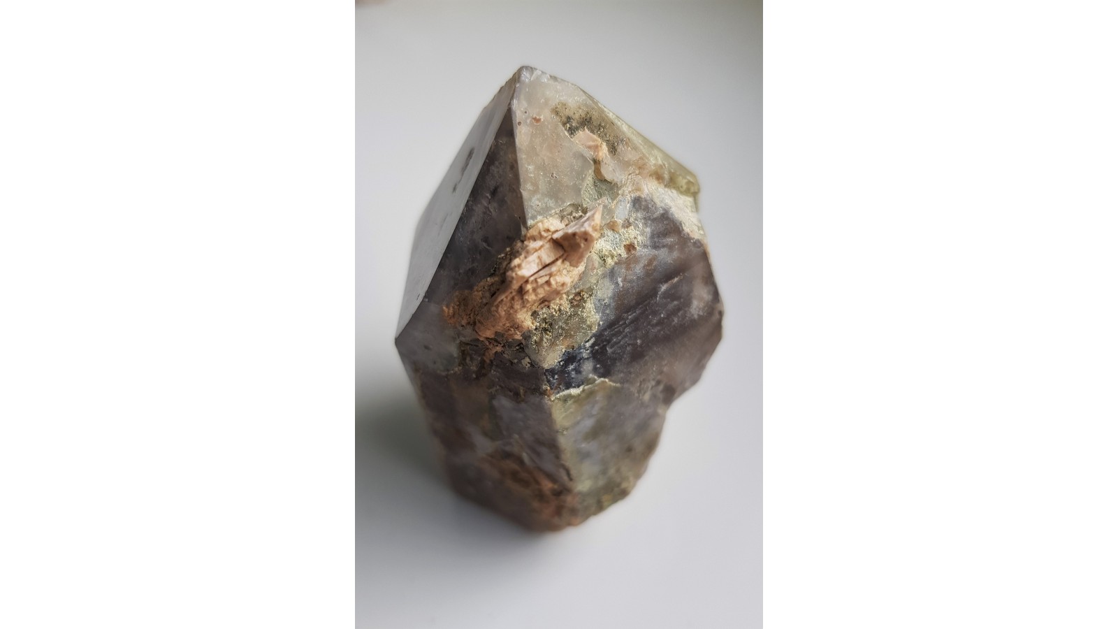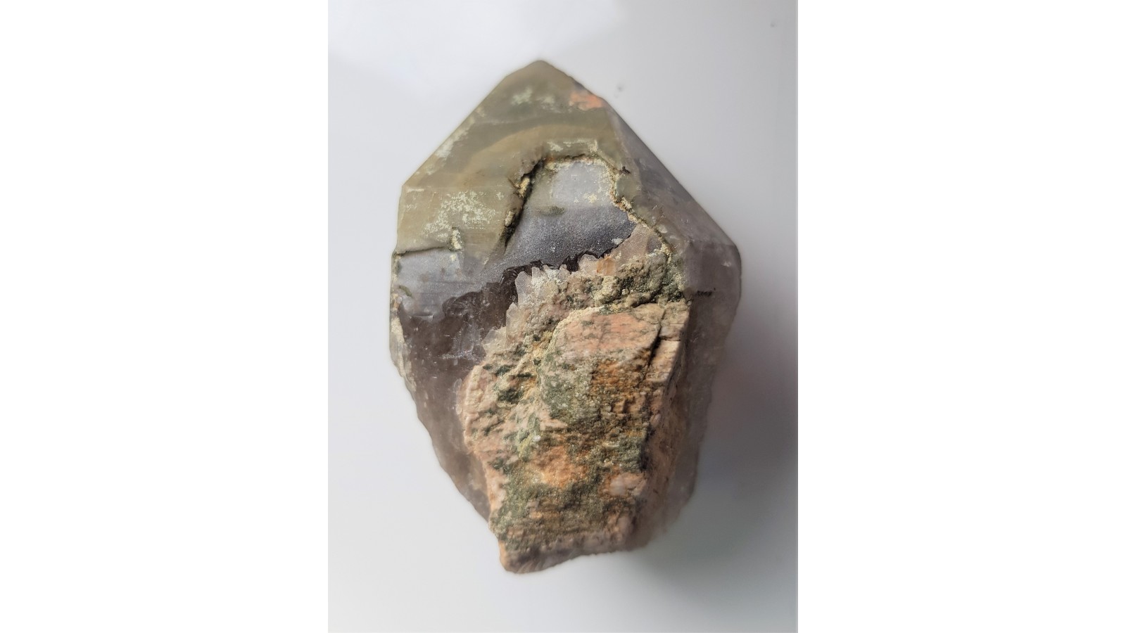 Kryształ kwarcu dymnego z Kotliny Jeleniogórskiej z zielonym zakończeniem (ostatnia generacja z wrostkami zielonych minerałów nadających barwę kryształowi kwarcu). Idealne zakończenie, niezwykła barwa kryształu. Dosyć duży, unikatowy okaz. Polecam.