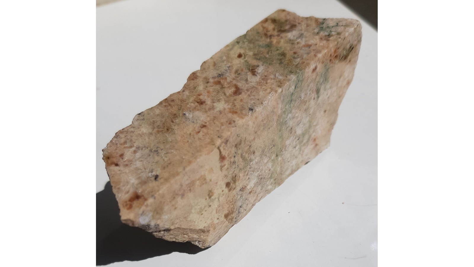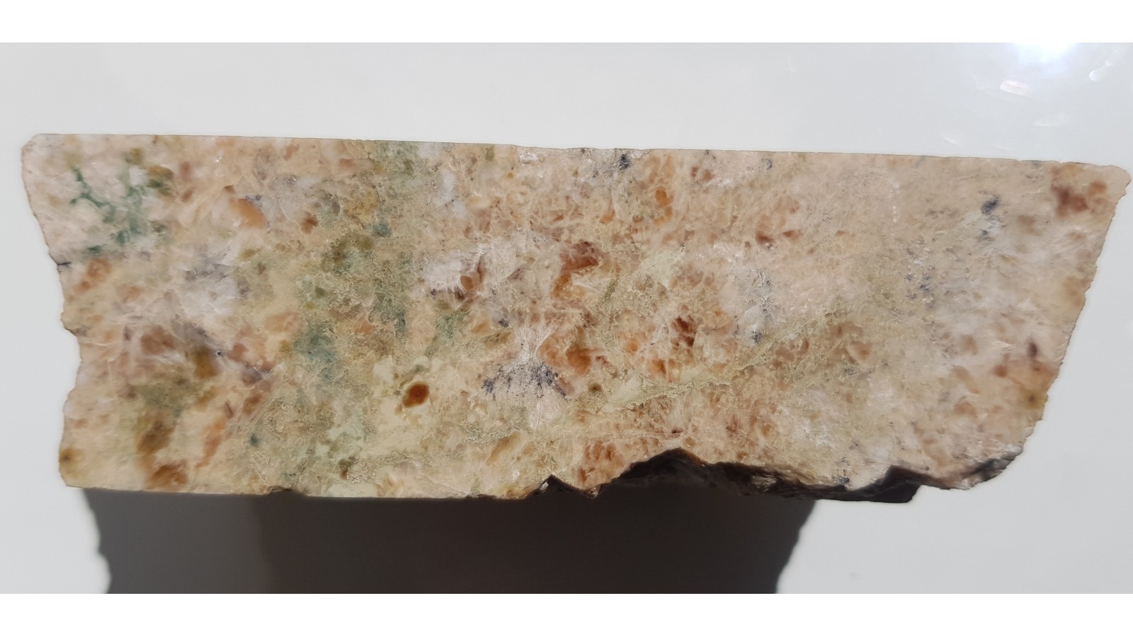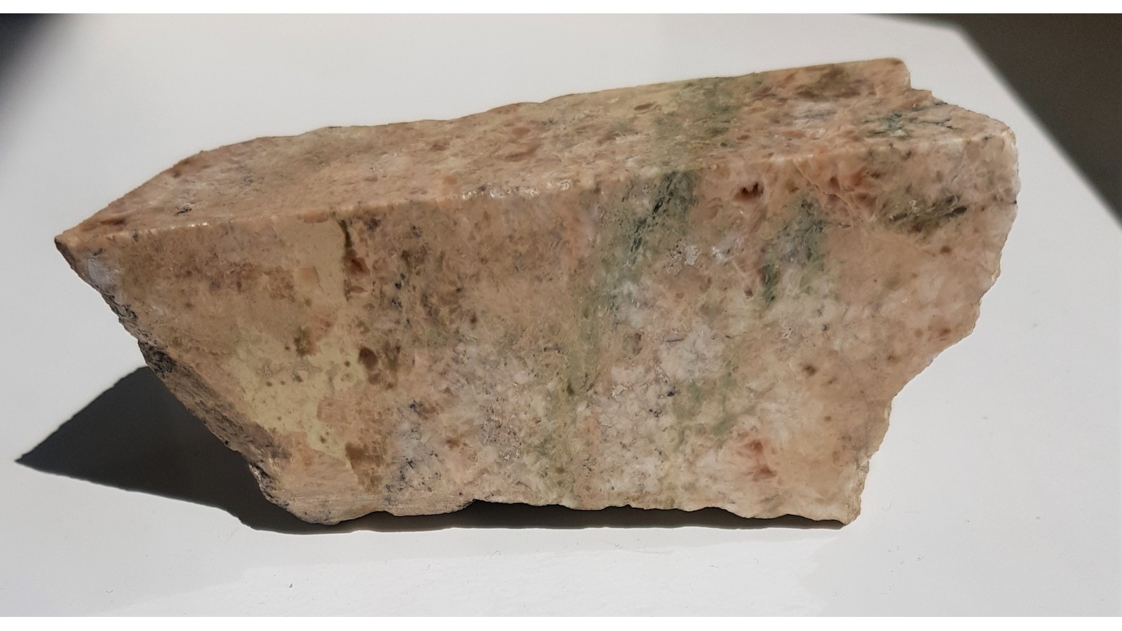 Polerowany okaz wyjątkowej skały złożonej niemal w całości z prehnitu z kamieniołomu w Jordanowie Śląskim. Wykonano badanie xrd próby. Na zgładzie widoczne poszczególne osobniki prehnitu o barwie różowomiodowej. Próbka sprzed wielu lat. Rzadko wystepujący w Jordanowie minerał. Piękny poler.