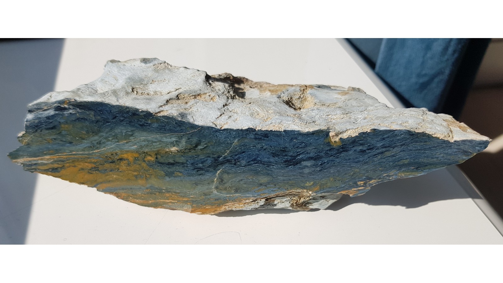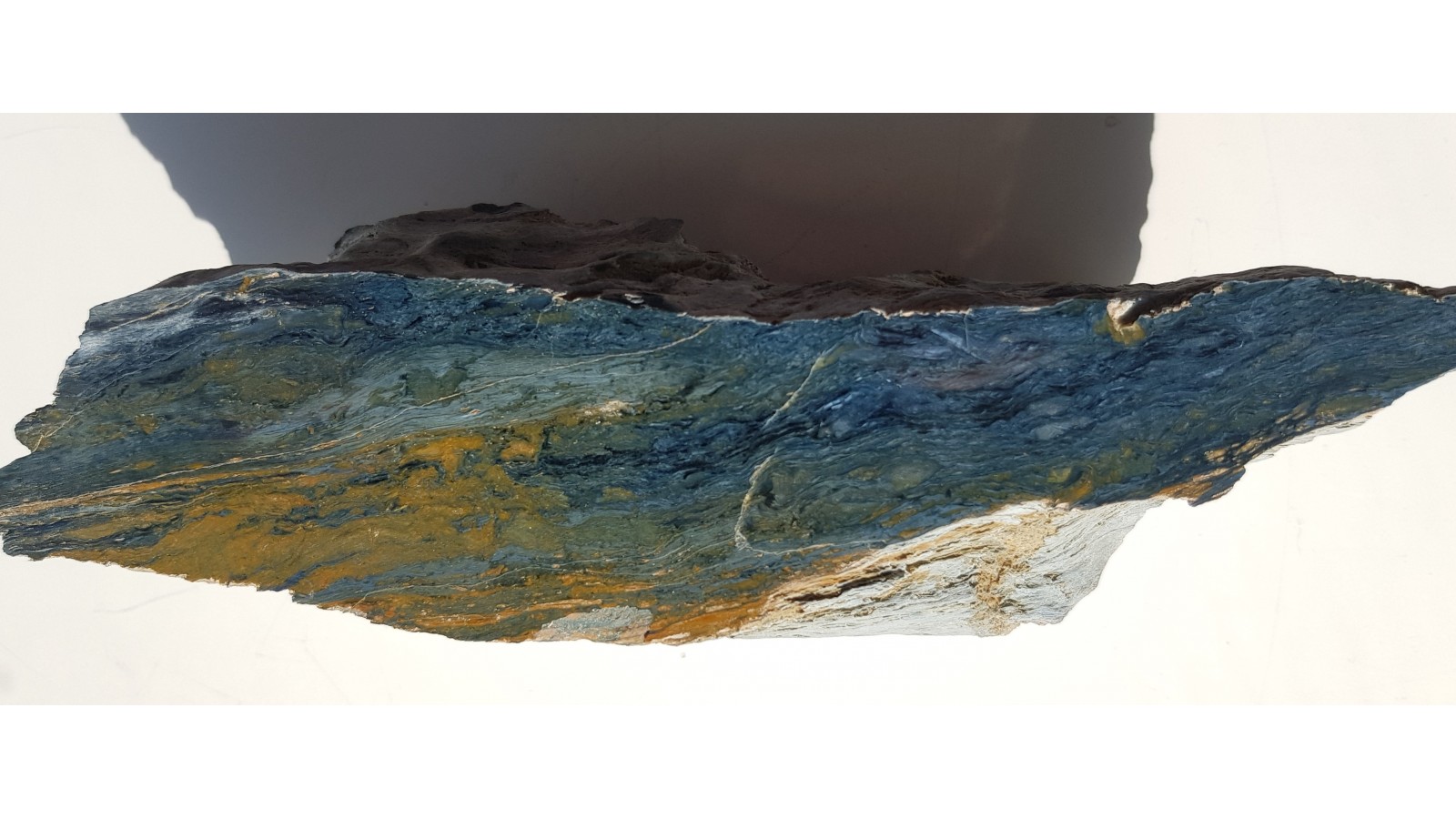 Żyła intensywnie niebieskiego amfibolu magnezowego - rodusytu (synonim magnesioriebeckitu). Okaz polerowany. Miejscami widoczna gra światła. Piękny, intensywnie zabarwiony, masywny okaz. Ciekawostką jest fakt, że w Kazachstanie rodusyt występuje w skałach osadowych, prawdopodobnie dolomitach bądź wapieniach w formie żył. Bywa obrabiany jako kamień ozdobny do wstawek biżuteryjnych.