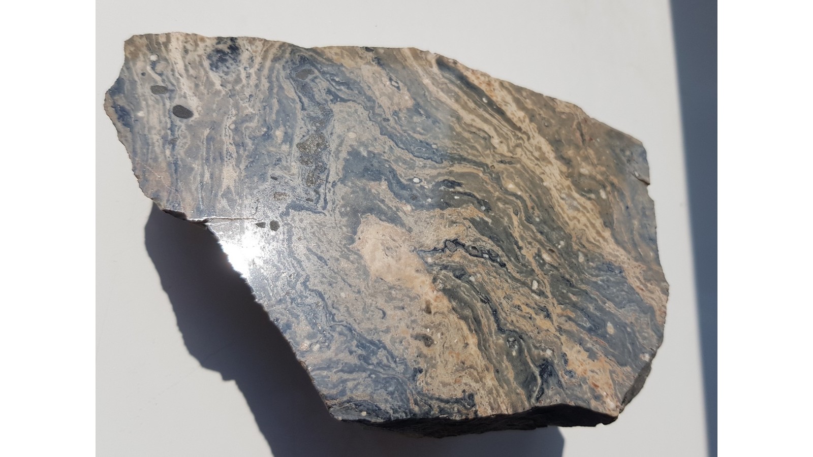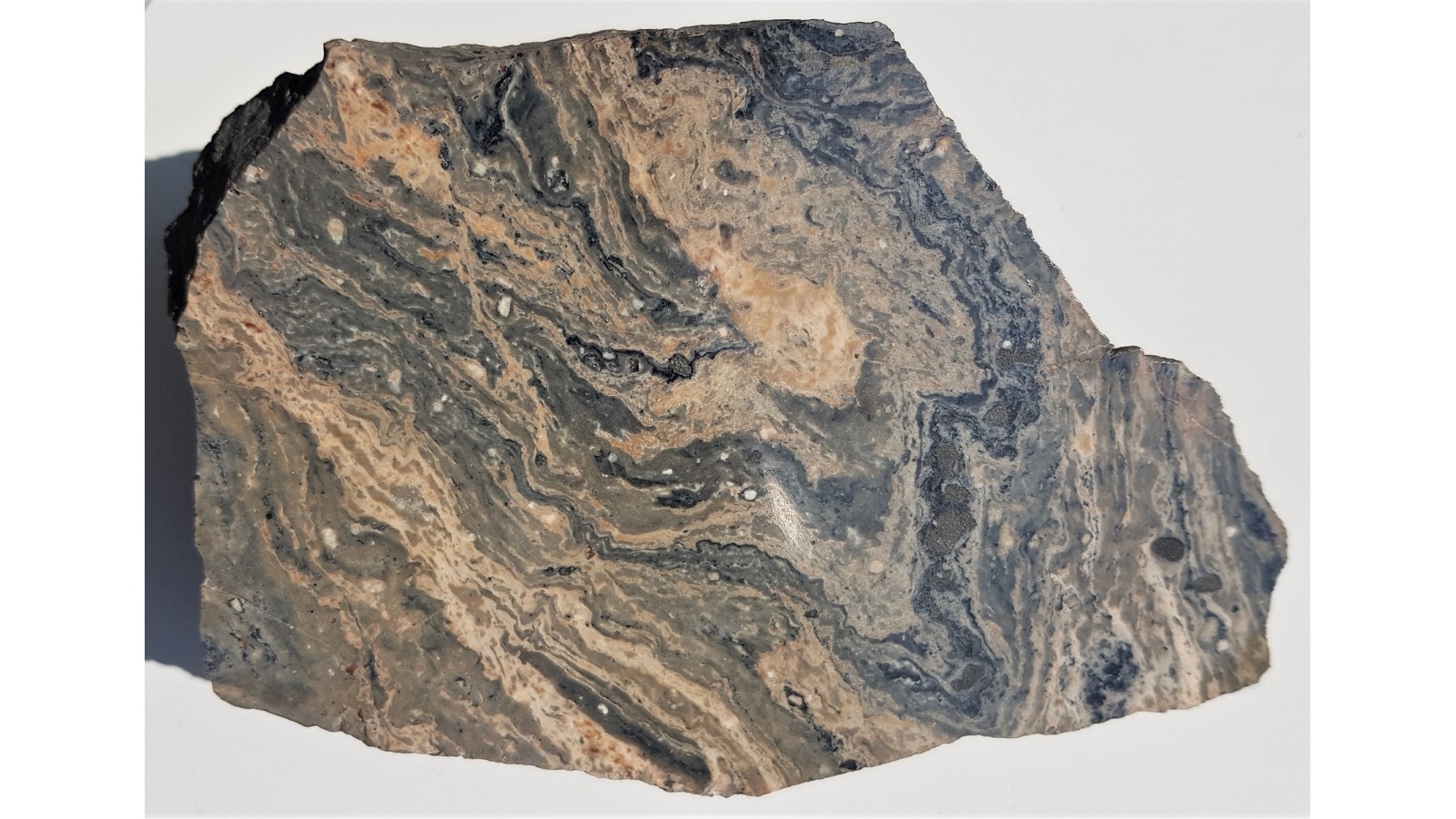 Polerowany okaz ignimbrytu z Wałbrzycha. Okaz z wyrazistymi teksturami fluidalnymi, masywny, niespękany. Strona przeciwna nie cięta, naturalna.