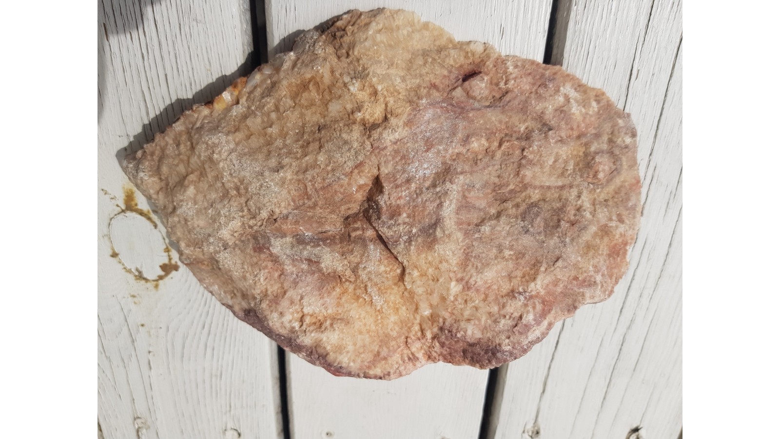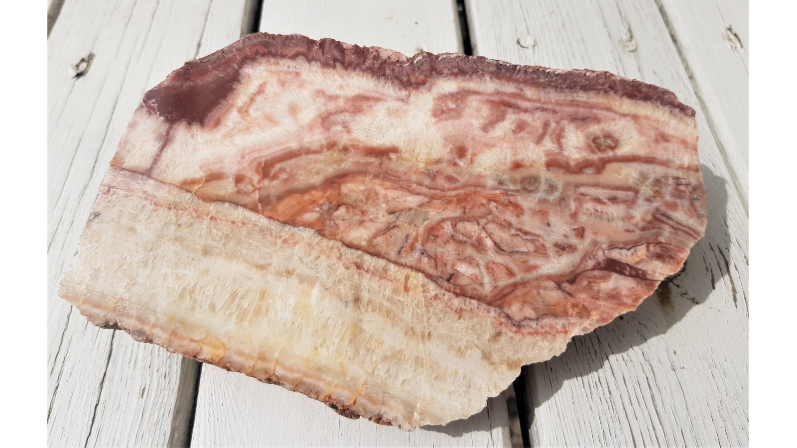 Polerowana płyta różanki zelejowskiej z Zelejowej k. Kielc. Historyczny materiał wykorzystywany dawniej w architekturze rejonu świętokrzyskiego. Obecnie łom różanki zelejowskiej jest rezerwatem przyrody. Duży, piękny okaz o wyrazistej teksturze. Różanka jest zespoloną kalcytem brekcją tektoniczną z charakterystycznym deseniem. Okaz poddany obróbce obecnie, lecz sprzed wielu lat. Polecam.