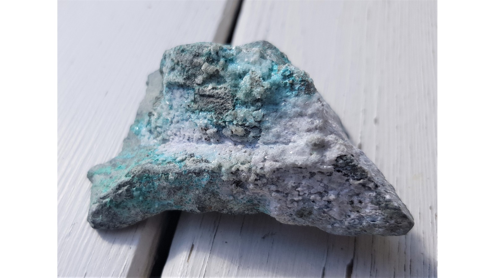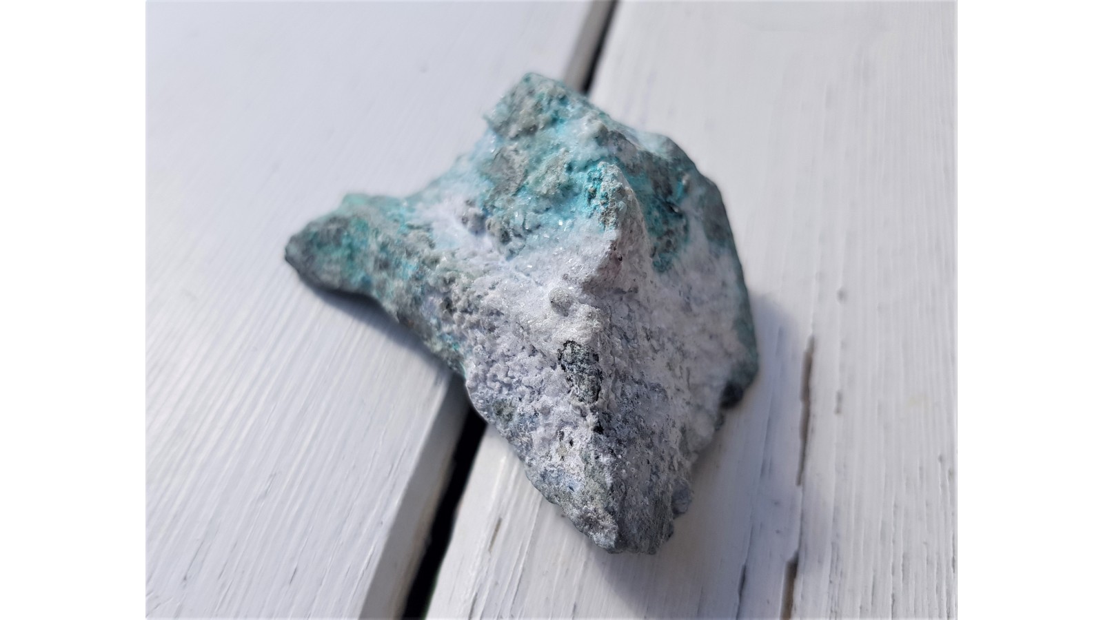 Śnieżnobiały hydrocynkit razem z devillinem, langitem i gipsem jako powłoki na łupkach amfibolowych ze złoża rud z Ciechanowic k. Miedzianki sudeckiej. Bardzo ładny minerał i ciekawostka mineralogiczna do kolekcji regionalnej.