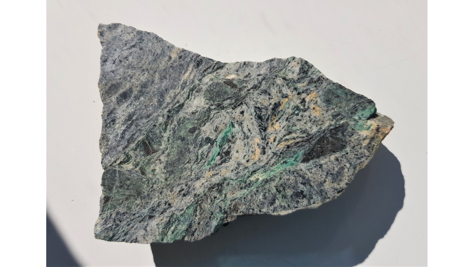 Polerowany okaz złotonośnego listwenitu z chromowozielonymi minerałami w próbce. Skały tego typu są w Armenii nazywane sevańskim żadem (sevan jade, Russian Gemostone Encyclopedia, V.V. Bukanov) z uwagi na barwę minerałów zawierających chrom. Okaz ze złoża Szorża. Strona przeciwna naturalna, nie cięta.