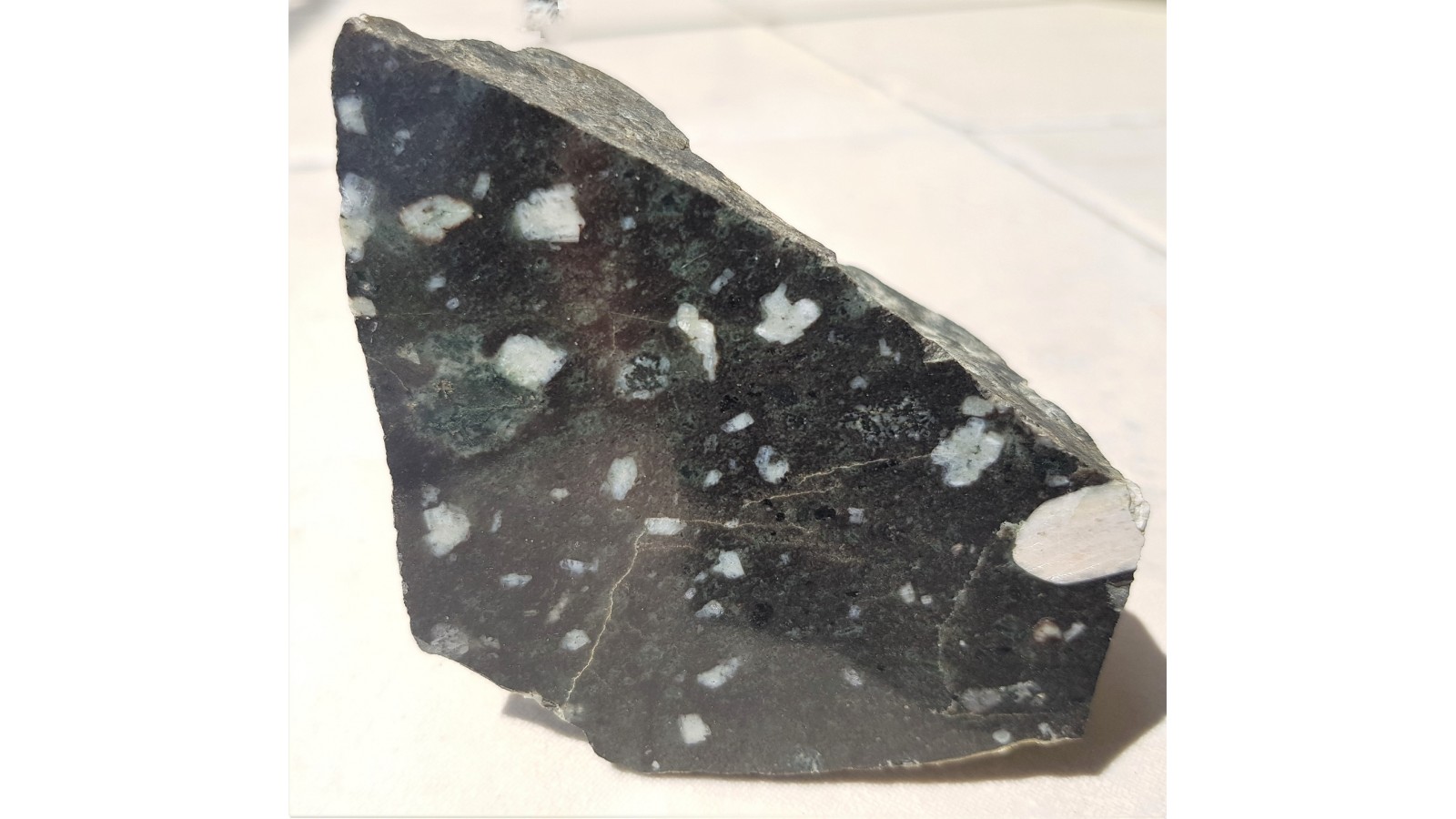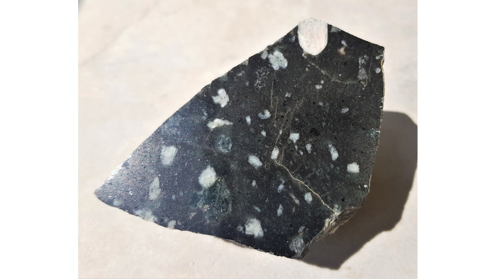 Spropilityzowana skała magmowa o teksturze porfirowej z fenokryształami jasnych skaleni oraz licznymi ziarnami minerałów rudnych rozsianych w masie skały. Propilityzacja jest procesem hydrotermalnego przeobrażenia skały, w trakcie którego często zostaje ona wzbogacona w minerały rudne, jak w tym przypadku. Skała nietypowa dla Miedzianki, znajdowana na hałdach rzadko. Okaz z jednej strony polerowany, masywny.