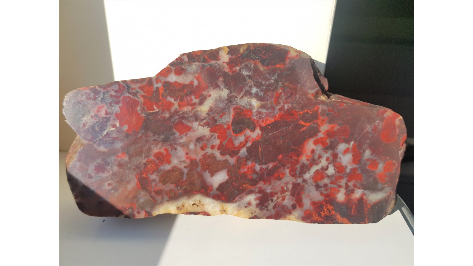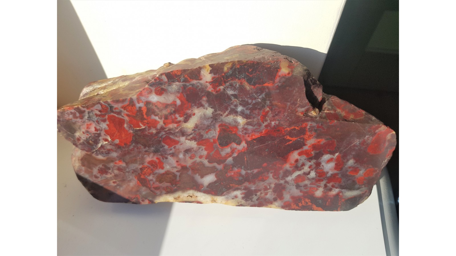 Wyjątkowy okaz jaspisu z Kamiennej Góry. Okaz z plamami intensywnej czerwieni w lekko przejrzystm, jasnym kwarcu i chalcedonie. Okaz niespękany, duży, kontrastowy. Gruby, polerowny plaster. Polecam.