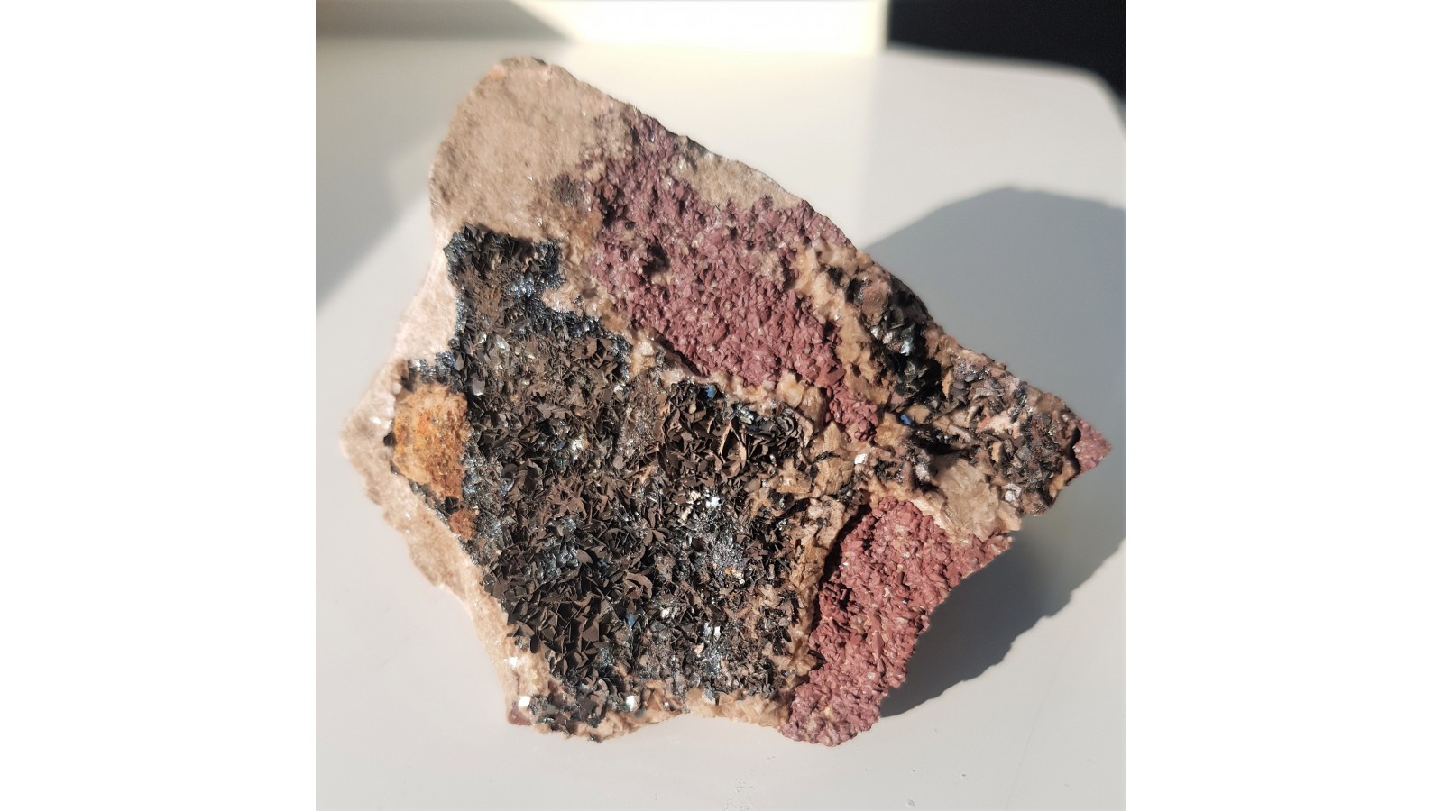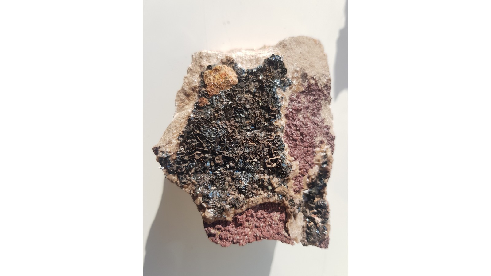 Okaz krystalicznego hematytu z kamieniołomu dolomitu w Rędzinach k. Kamiennej Góry. Szczotka pięknie połłyskujących kryształów hematytu na dolomicie. Okaz kontrastowy, piękne kryształy w dużej ilości.