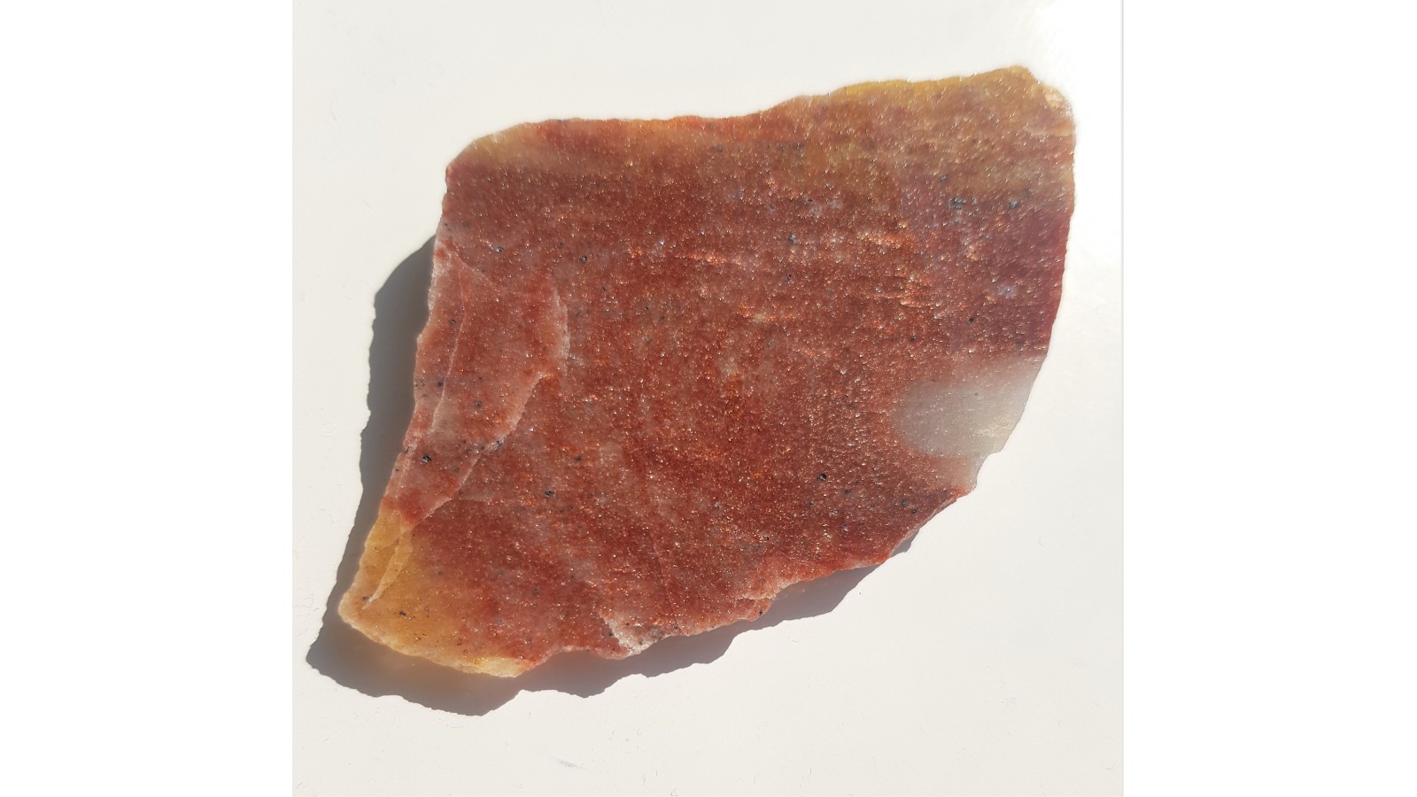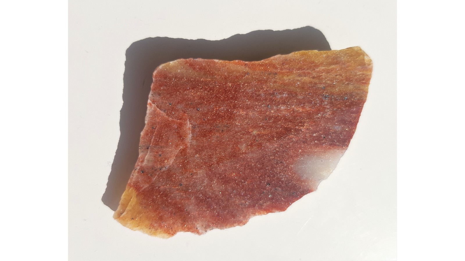 Polerowana płytka intensywnie świecącego awenturynu z wyjątkowego znaleziska w Jegłowej. Znalezisko sprzed około 10-ciu lat. Okazy z dawnych hałd z okolicy wyrobiska łupków kwarcytowych. Znalezisko autorskie, słabo znane wśród kolekcjonerów i pasjonatów kamieni odzobnych Sudetów.