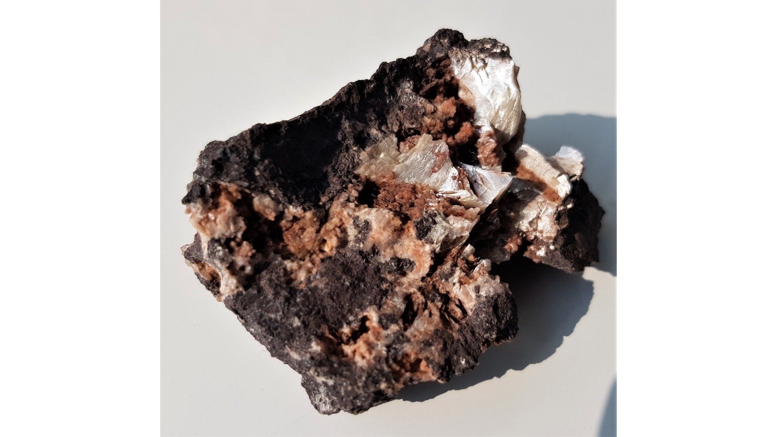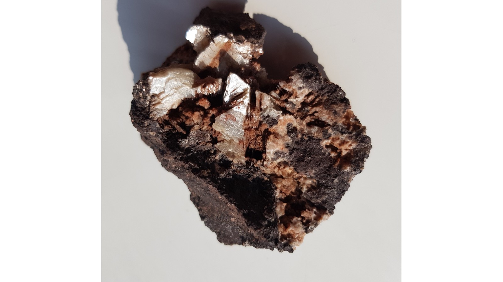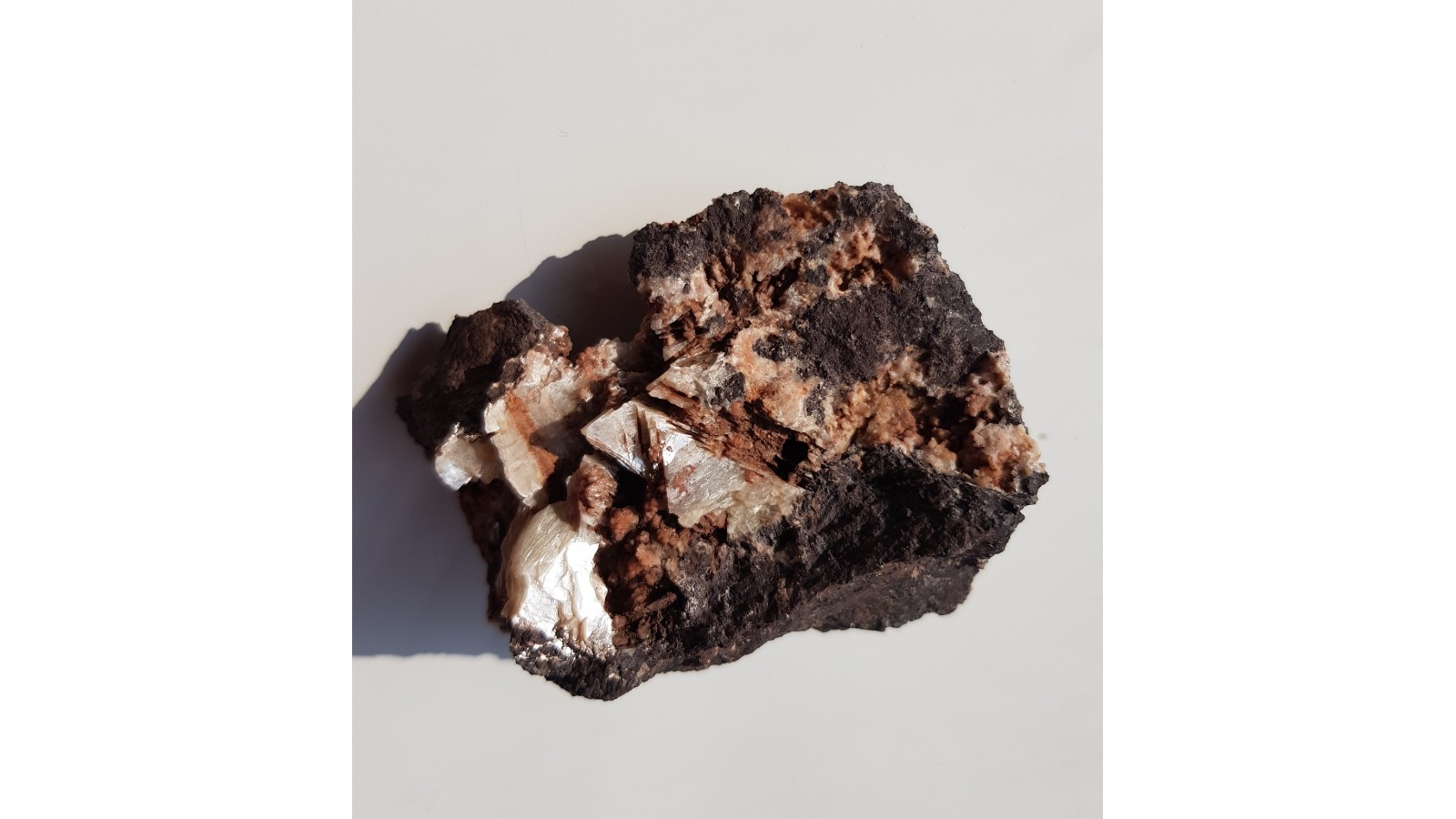 Pięknie, perłowo błyszczące, duże kryształy heulandytu w kawernowatym melafirze z okolic Suszyny - Mrówieńca k. Kłodzka. Rzadkość mineralogiczna, piękne wykształcenie kryształów i postać okazu.