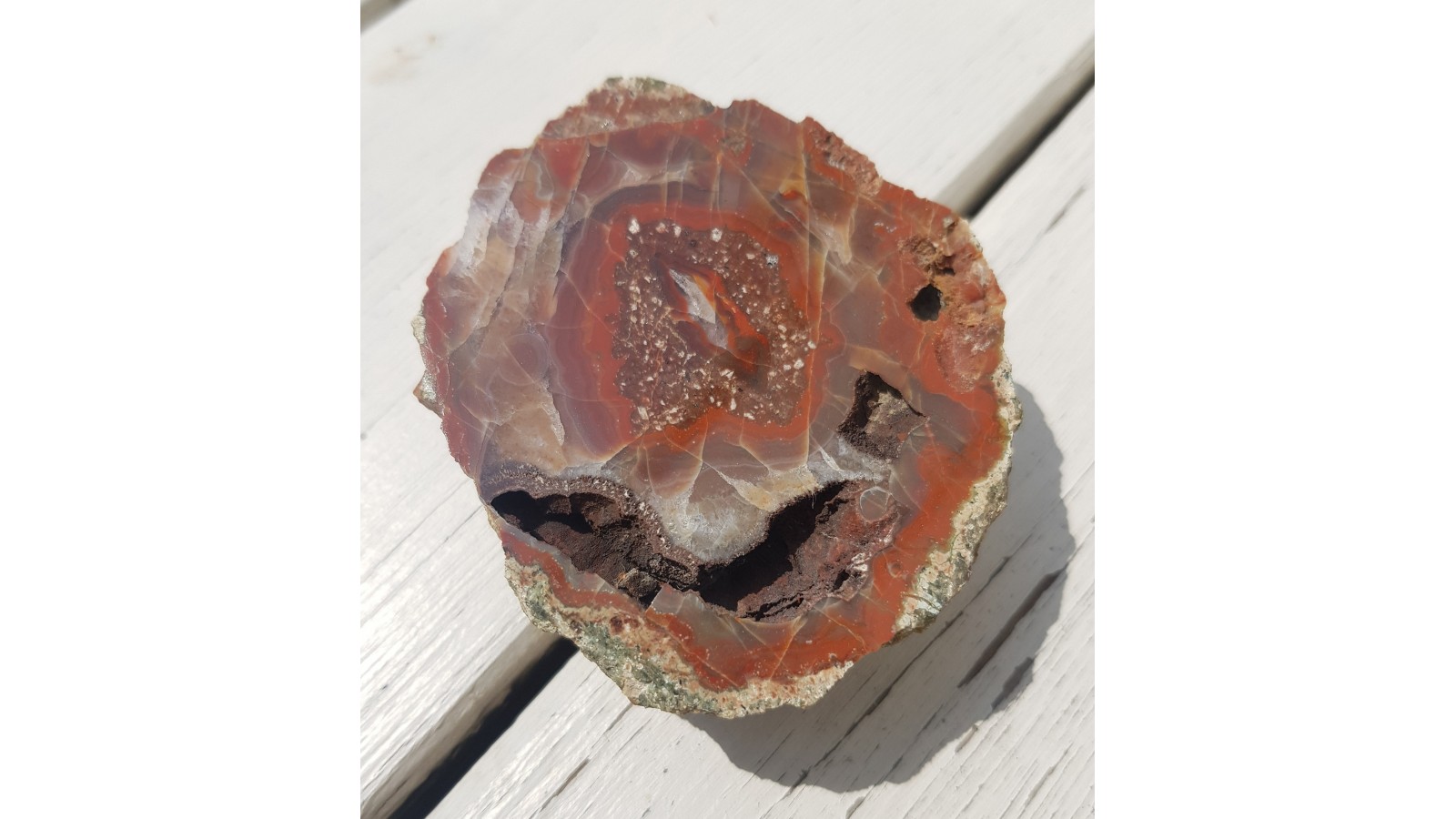 Polerowany agat z Nowego Kościoła. Nietypowy okaz z pierścieniem ryolitowym wewnątrz geody.