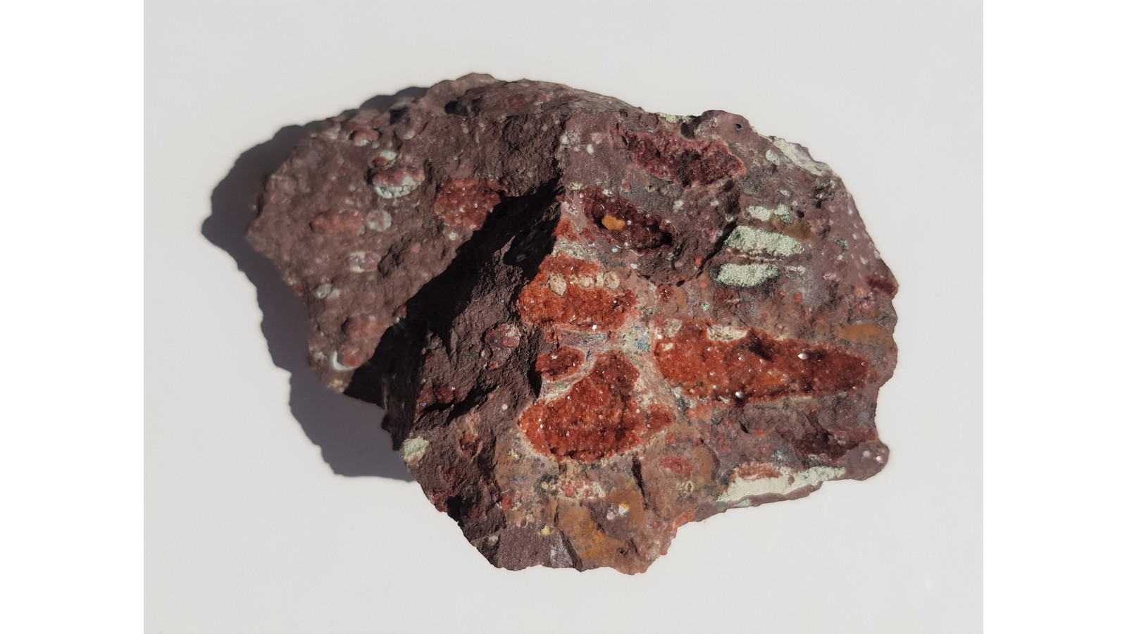 Okaz heulandytu z melafiru migdałowcowego z Tenczynka koło Krakowa. Czerwone kryształy heulandytu narastają na ściankach migdałów w melafirze. Kryształy świeże, dobrze wykształcone, o szklistym połysku.