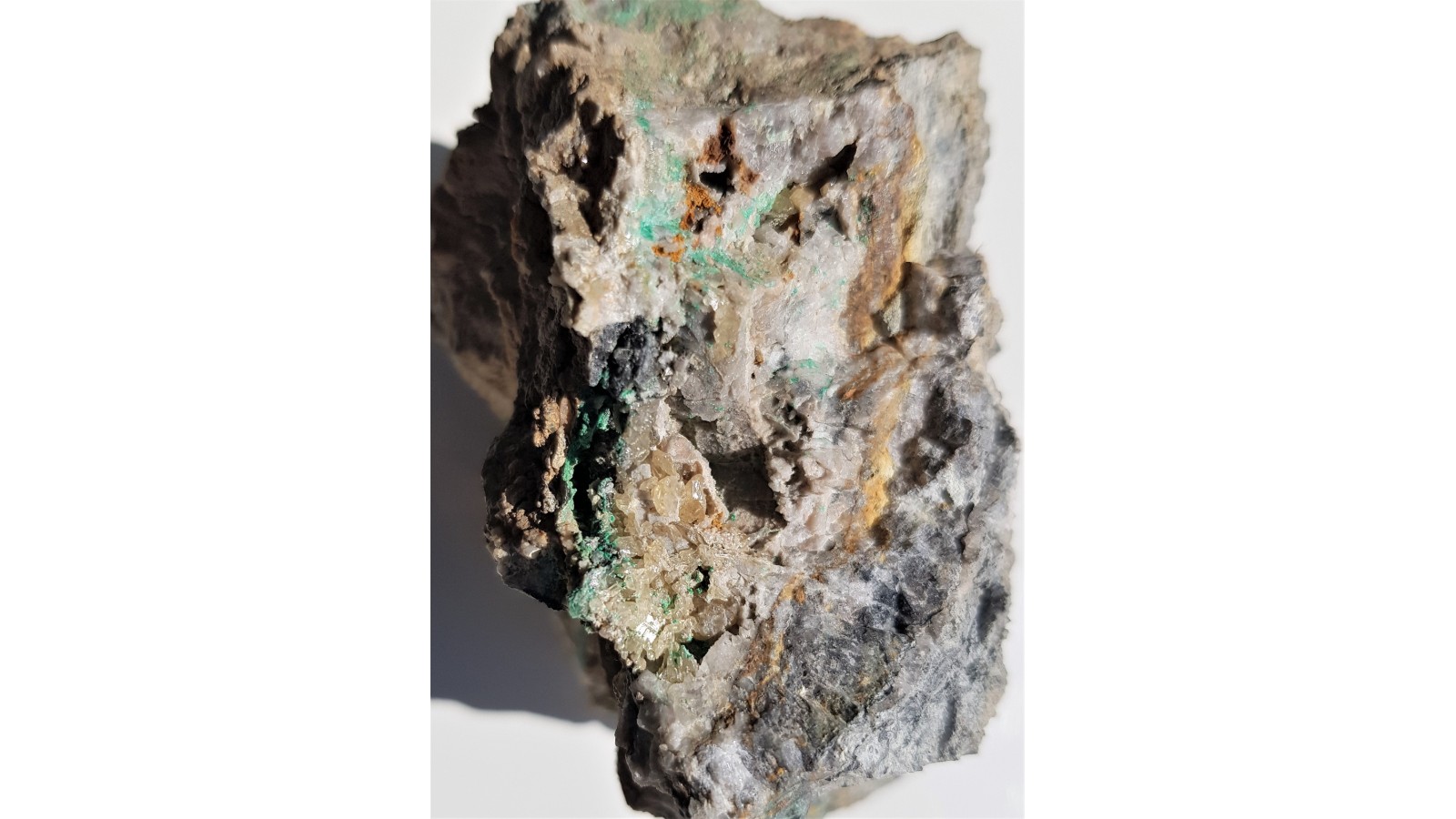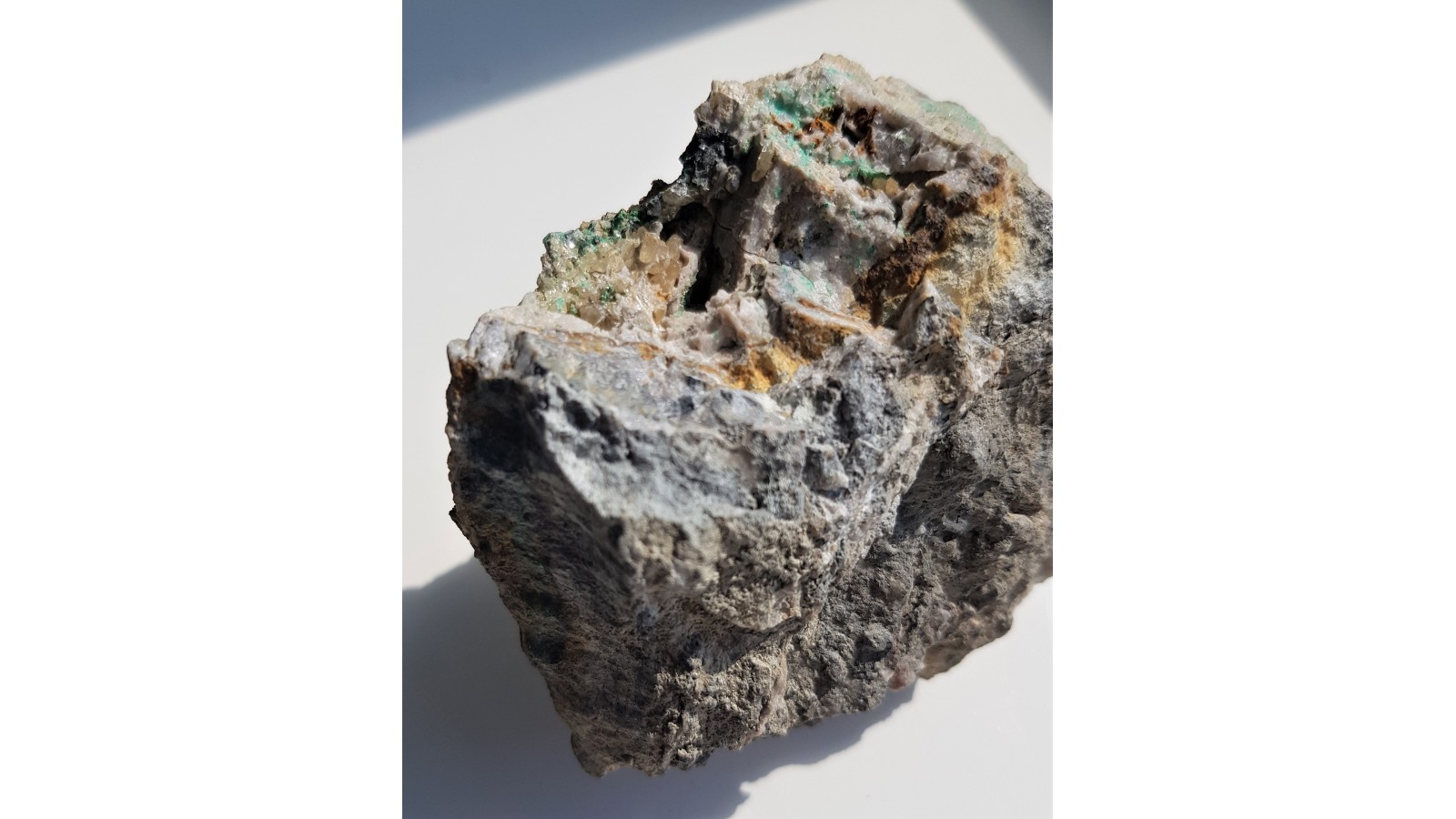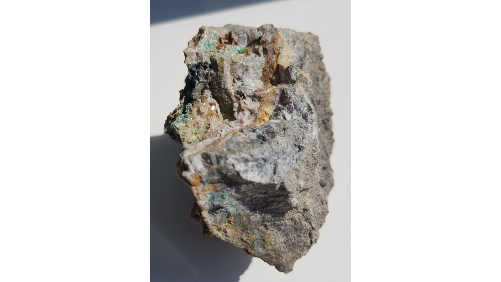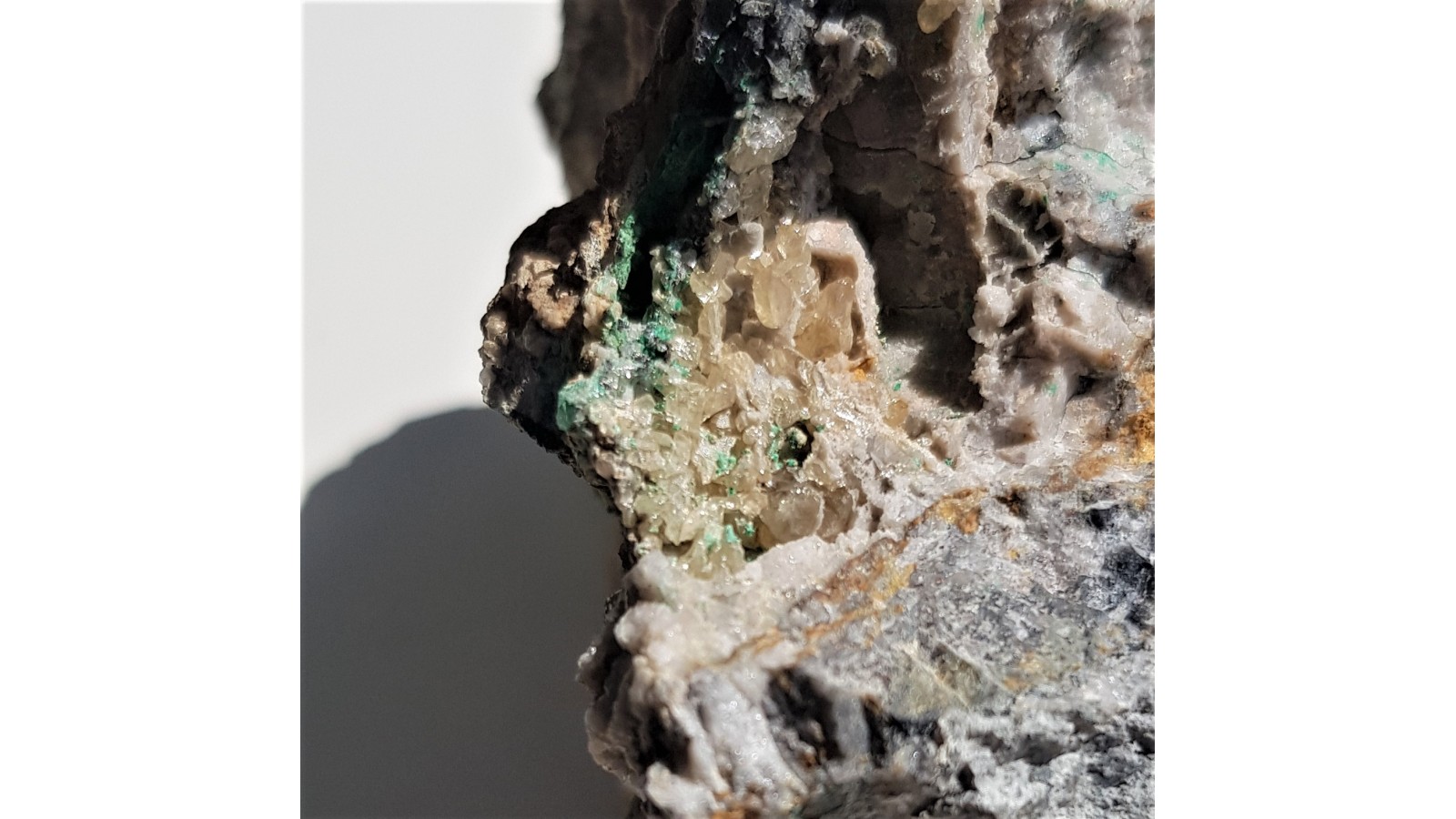 Przezroczyste, żłótawe kryształy cerusytu w kawernie skały żyłowej ze złoża rud miedzi i ołowiu Dorothea w Janowicach Wielkich k. Jeleniej Góry (nieopodal Miedzianki). Na okazie także naloty malachitu. Diamentowy połysk kryształów cerusytu.