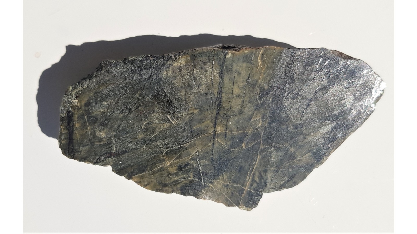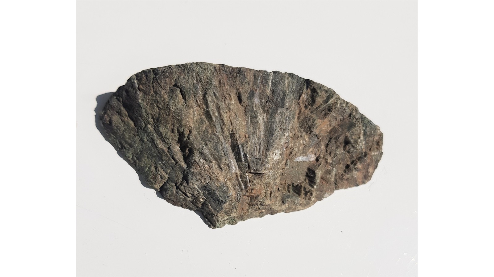 Okaz promienistego zrostu zielonoszarych kryształów diopsydu ze Złotego Stoku. Z jednej strony poler, z drugiej widoczny ładny promienisty zrost krysztów.