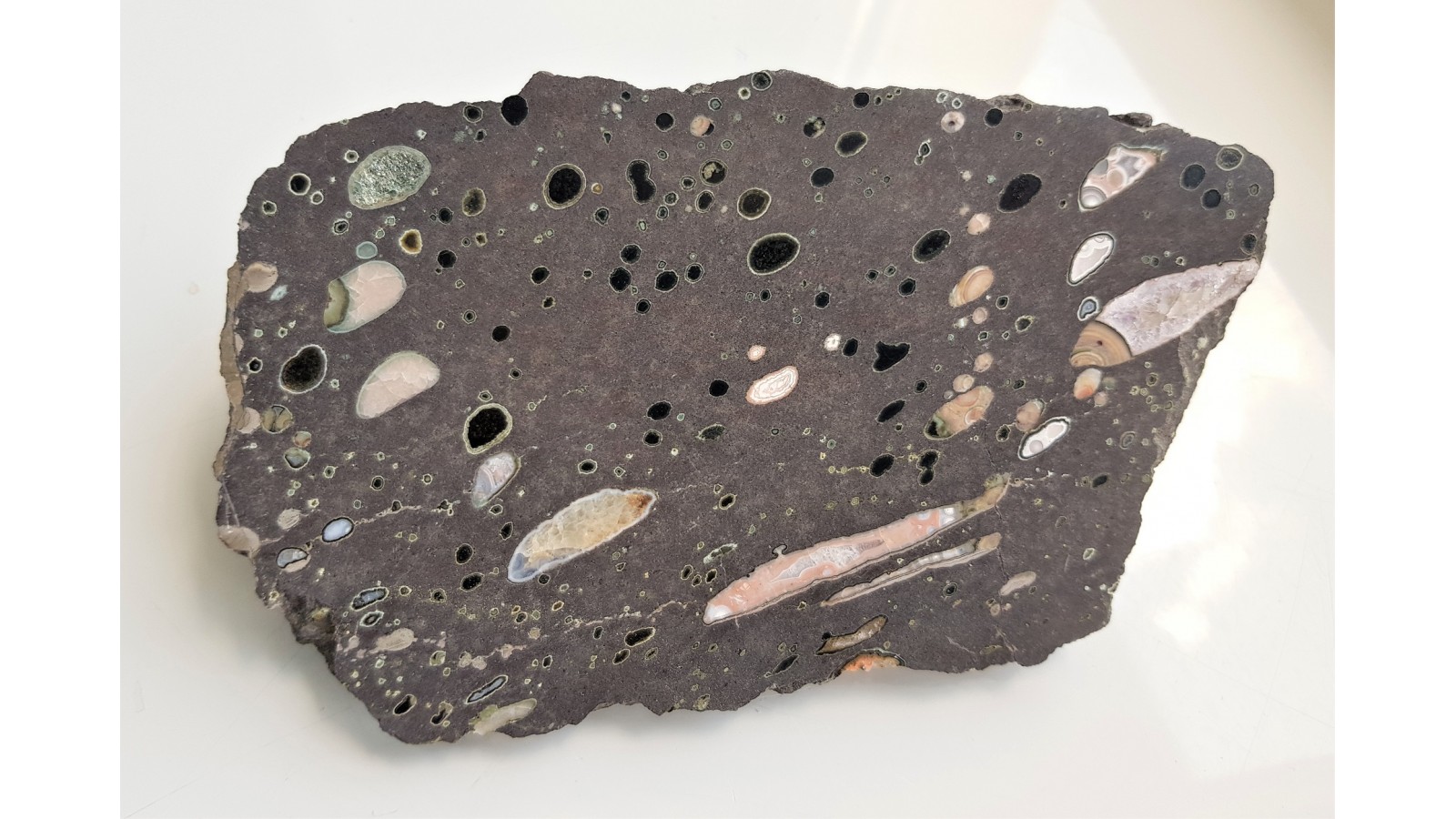 Polerowany okaz melafiru migdałowcowego z Lubiechowej. Na zgładzie widoczne - agat, ametyst węglany - przekrój przez minerały występujące w klasycznej lokalizacji.