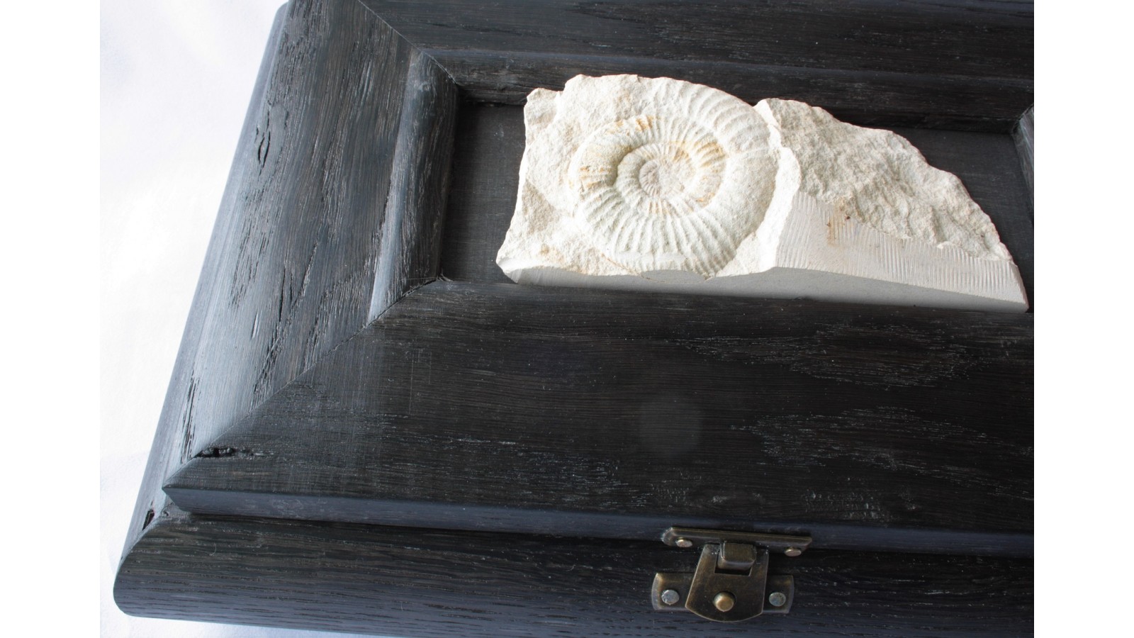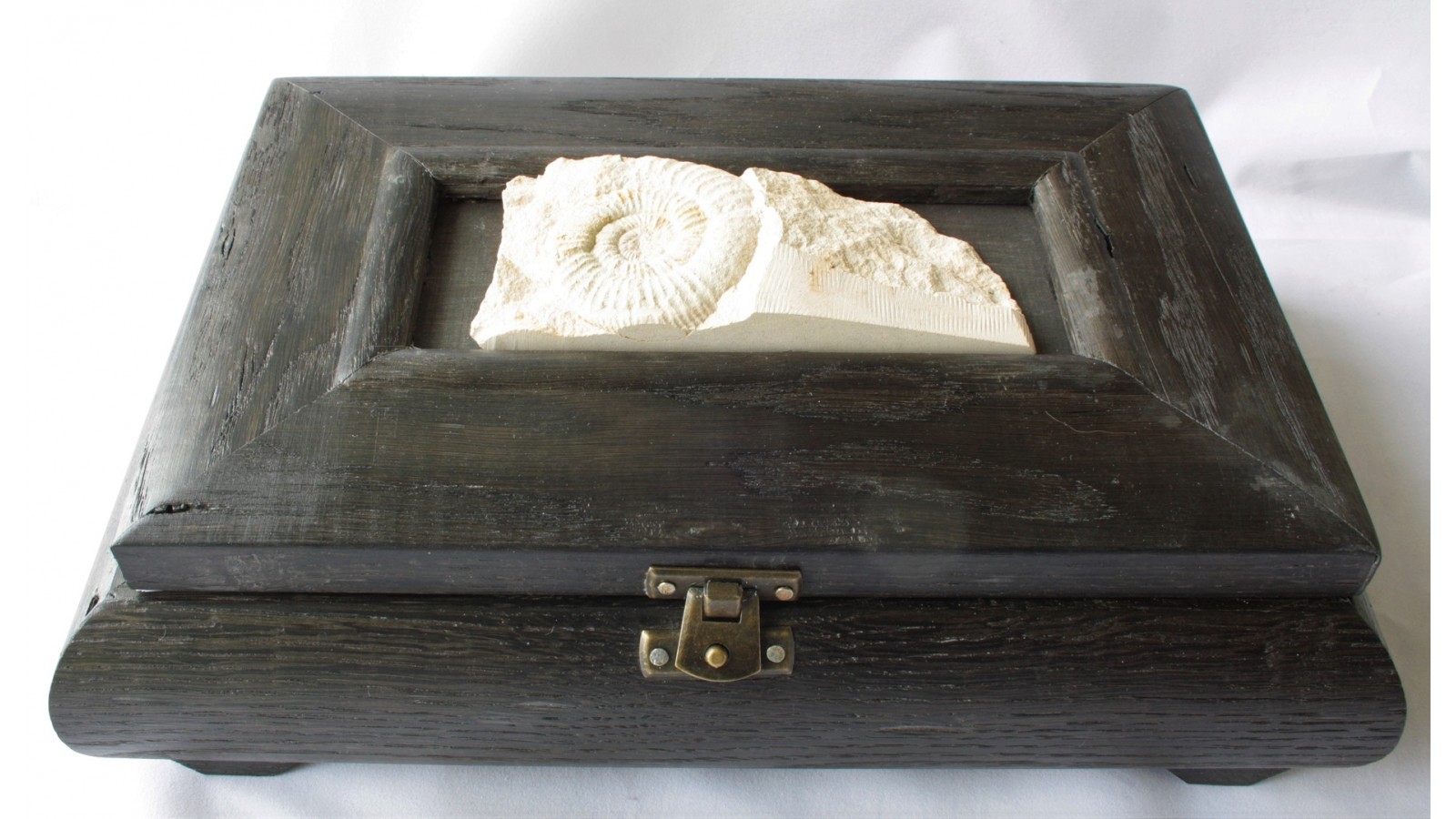 Szkatuła z dębu czarnego (bog oak, Mooreiche) z jurajskim amonitem